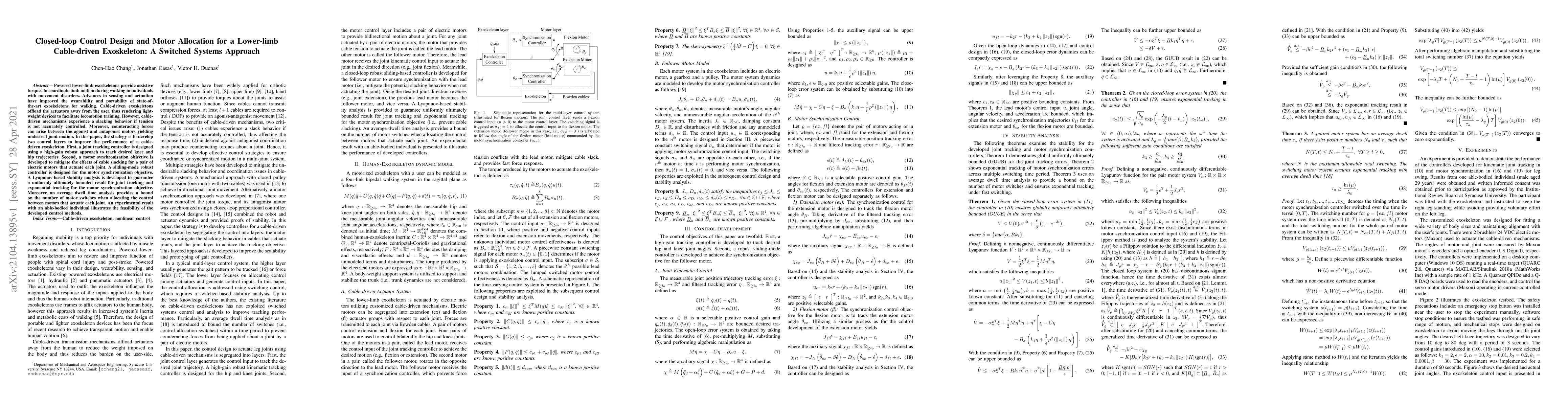 Powered lower-limb exoskeletons provide assistive torques to coordinate limb motion during walking in individuals with movement disorders. Advances in sensing and actuation have improved the wearability and portability of state-of-the-art exoskeletons for walking. Cable-driven exoskeletons offload the actuators away from the user, thus rendering light-weight devices to facilitate locomotion training. However, cable-driven mechanisms experience a slacking behavior if tension is not accurately controlled. Moreover, counteracting forces can arise between the agonist and antagonist motors yielding undesired joint motion. In this paper, the strategy is to develop two control layers to improve the performance of a cable-driven exoskeleton. First, a joint tracking controller is designed using a high-gain robust approach to track desired knee and hip trajectories. Second, a motor synchronization objective is developed to mitigate the effects of cable slacking for a pair of electric motors that actuate each joint. A sliding-mode robust controller is designed for the motor synchronization objective. A Lyapunov-based stability analysis is developed to guarantee a uniformly ultimately bounded result for joint tracking and exponential tracking for the motor synchronization objective. Moreover, an average dwell time analysis provides a bound on the number of motor switches when allocating the control between motors that actuate each joint. An experimental result with an able-bodied individual illustrates the feasibility of the developed control methods.
