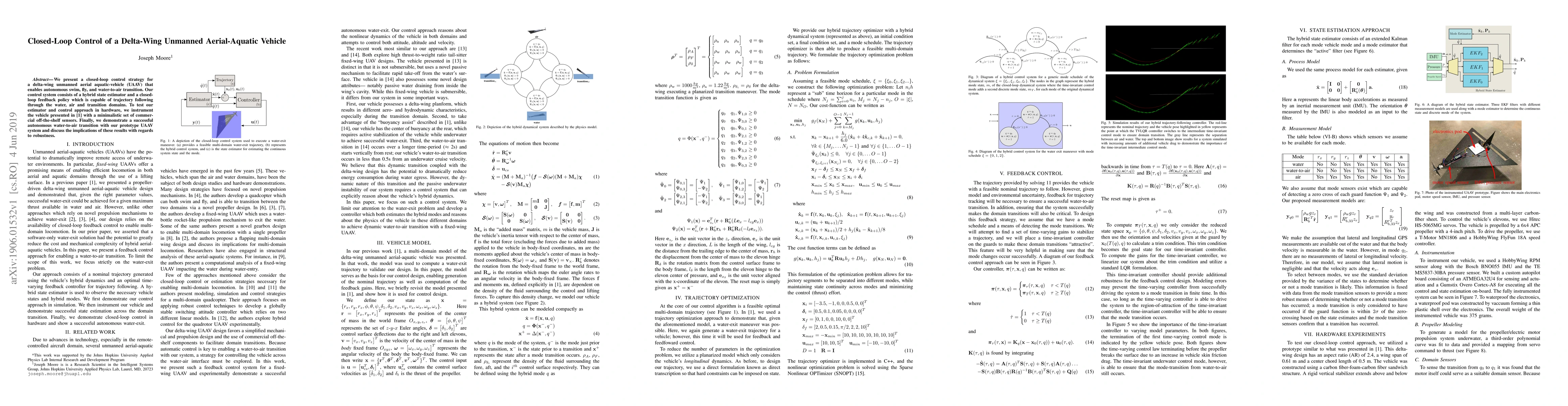 This paper proposes a closed-loop control strategy for a delta-wing UAAV, enabling autonomous transitions between swimming, flying, and water-to-air mode. The system combines a hybrid state estimator and feedback policy for trajectory following, tested with a minimal sensor setup, demonstrating successful autonomous transition.