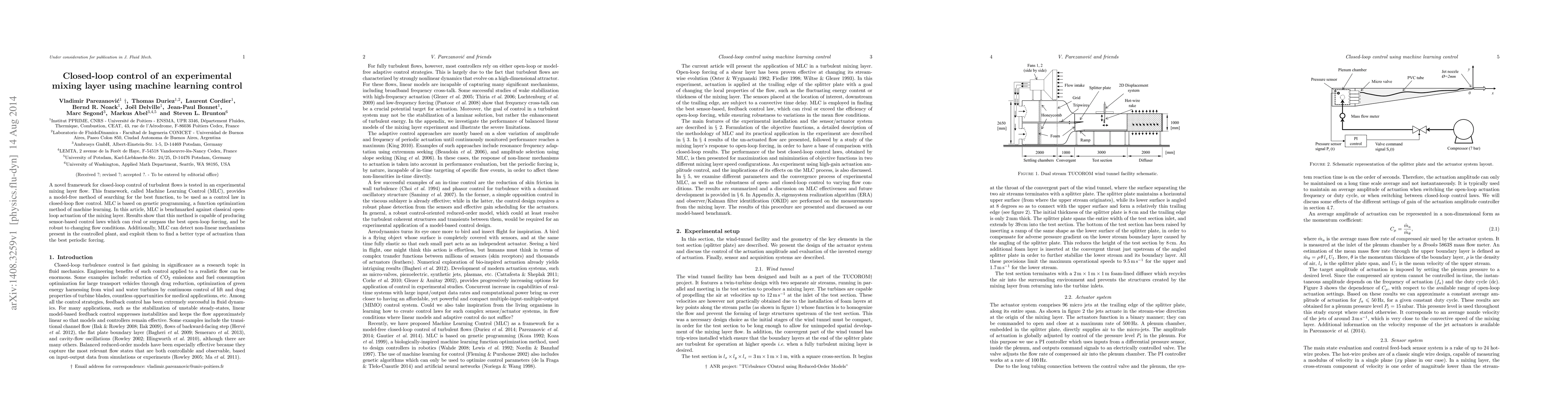 This paper proposes a novel machine learning control (MLC) framework for closed-loop control of turbulent flows, demonstrating its effectiveness in an experimental mixing layer. MLC, based on genetic programming, outperforms traditional open-loop actuation, showing robustness and the ability to exploit non-linear flow dynamics.