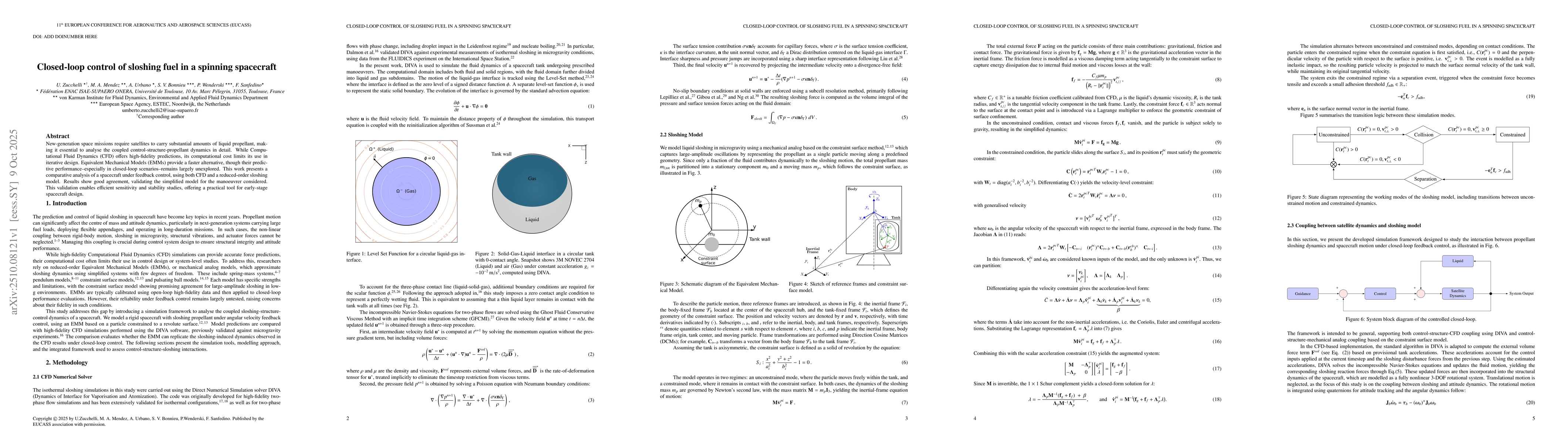The study combines Computational Fluid Dynamics (CFD) simulations with an Equivalent Mechanical Model (EMM) to analyze sloshing fuel dynamics in a spinning spacecraft under closed-loop control. The EMM is validated against CFD results and integrated into a feedback control framework to simulate coupled fluid-structure interactions.