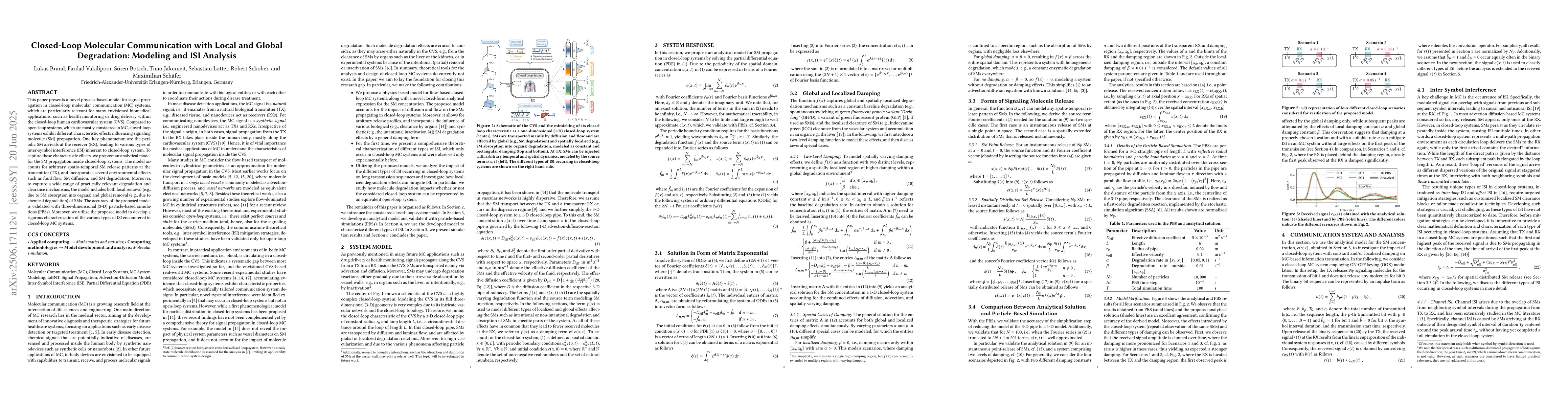 This paper presents a novel physics-based model for signal propagation in closed-loop molecular communication (MC) systems, which are particularly relevant for many envisioned biomedical applications, such as health monitoring or drug delivery within the closed-loop human cardiovascular system (CVS). Compared to open-loop systems, which are mostly considered in MC, closed-loop systems exhibit different characteristic effects influencing signaling molecule (SM) propagation. One key phenomenon are the periodic SM arrivals at the receiver (RX), leading to various types of inter-symbol interference (ISI) inherent to closed-loop system. To capture these characteristic effects, we propose an analytical model for the SM propagation inside closed-loop systems. The model accounts for arbitrary spatio-temporal SM release patterns at the transmitter (TX), and incorporates several environmental effects such as fluid flow, SM diffusion, and SM degradation. Moreover, to capture a wide range of practically relevant degradation and clearance mechanisms, the model includes both local removal (e.g., due to SM absorption into organs) and global removal (e.g., due to chemical degradation) of SMs. The accuracy of the proposed model is validated with three-dimensional (3-D) particle-based simulations (PBSs). Moreover, we utilize the proposed model to develop a rigorous characterization of the various types of ISI encountered in closed-loop MC systems.