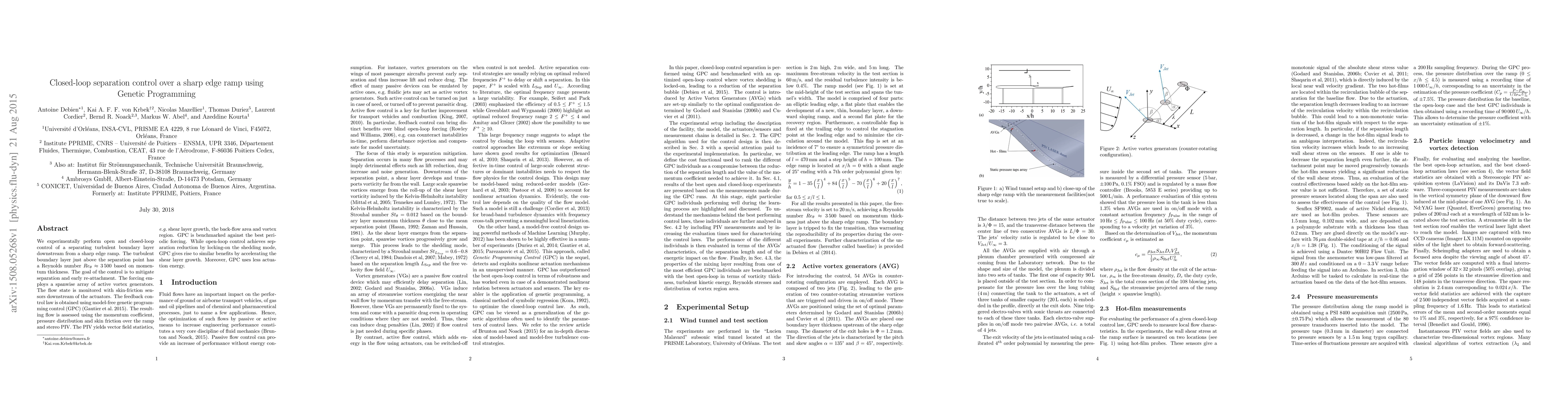 This paper explores the use of genetic programming control (GPC) to mitigate separation in a turbulent boundary layer over a sharp edge ramp, employing active vortex generators. GPC achieves comparable separation reduction to periodic forcing while using less actuation energy.