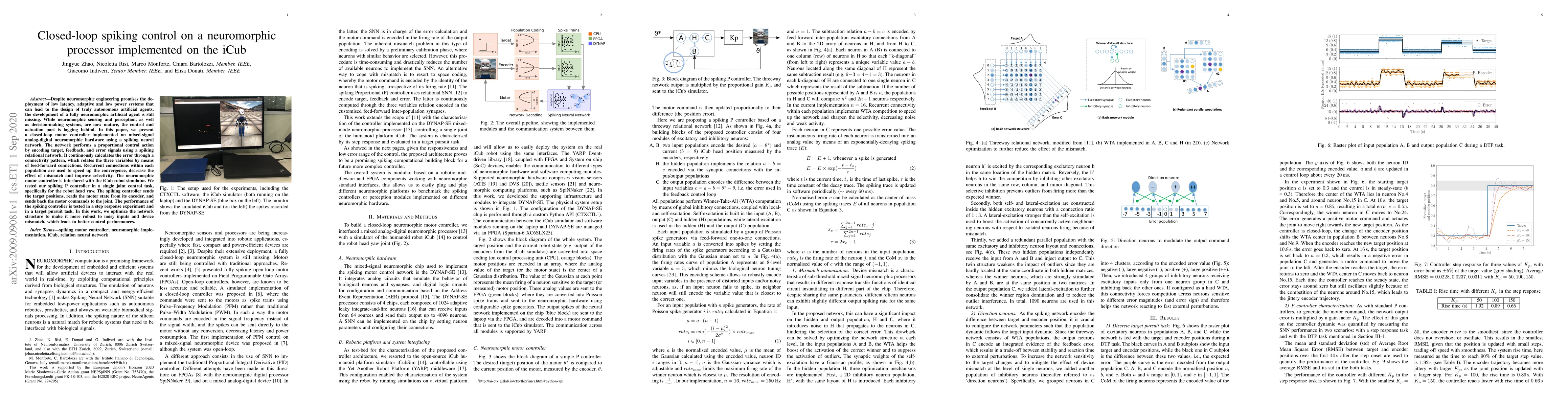 Despite neuromorphic engineering promises the deployment of low latency, adaptive and low power systems that can lead to the design of truly autonomous artificial agents, the development of a fully neuromorphic artificial agent is still missing. While neuromorphic sensing and perception, as well as decision-making systems, are now mature, the control and actuation part is lagging behind. In this paper, we present a closed-loop motor controller implemented on mixed-signal analog-digital neuromorphic hardware using a spiking neural network. The network performs a proportional control action by encoding target, feedback, and error signals using a spiking relational network. It continuously calculates the error through a connectivity pattern, which relates the three variables by means of feed-forward connections. Recurrent connections within each population are used to speed up the convergence, decrease the effect of mismatch and improve selectivity. The neuromorphic motor controller is interfaced with the iCub robot simulator. We tested our spiking P controller in a single joint control task, specifically for the robot head yaw. The spiking controller sends the target positions, reads the motor state from its encoder, and sends back the motor commands to the joint. The performance of the spiking controller is tested in a step response experiment and in a target pursuit task. In this work, we optimize the network structure to make it more robust to noisy inputs and device mismatch, which leads to better control performances.