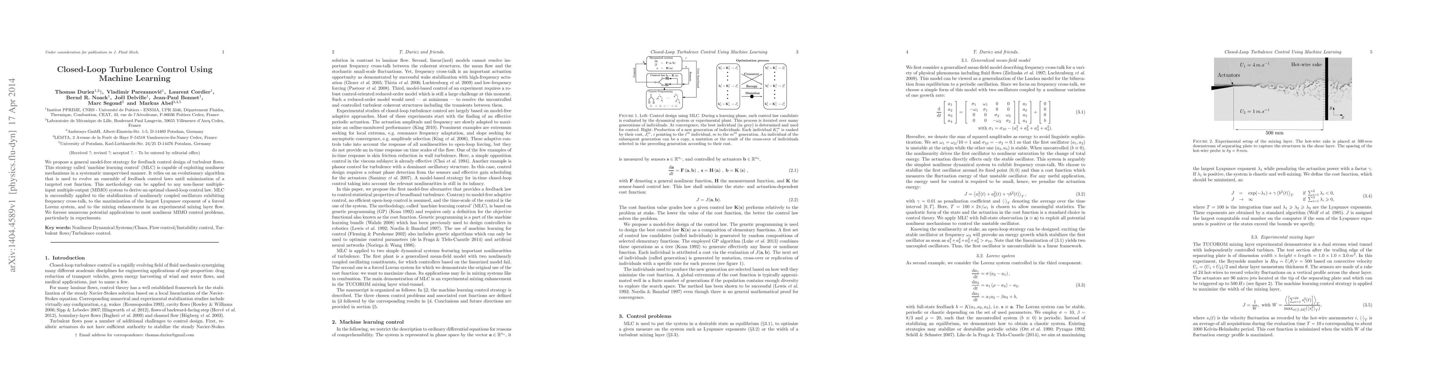 We propose a general model-free strategy for feedback control design of turbulent flows. This strategy called 'machine learning control' (MLC) is capable of exploiting nonlinear mechanisms in a systematic unsupervised manner. It relies on an evolutionary algorithm that is used to evolve an ensemble of feedback control laws until minimization of a targeted cost function. This methodology can be applied to any non-linear multiple-input multiple-output (MIMO) system to derive an optimal closed-loop control law. MLC is successfully applied to the stabilization of nonlinearly coupled oscillators exhibiting frequency cross-talk, to the maximization of the largest Lyapunov exponent of a forced Lorenz system, and to the mixing enhancement in an experimental mixing layer flow. We foresee numerous potential applications to most nonlinear MIMO control problems, particularly in experiments.