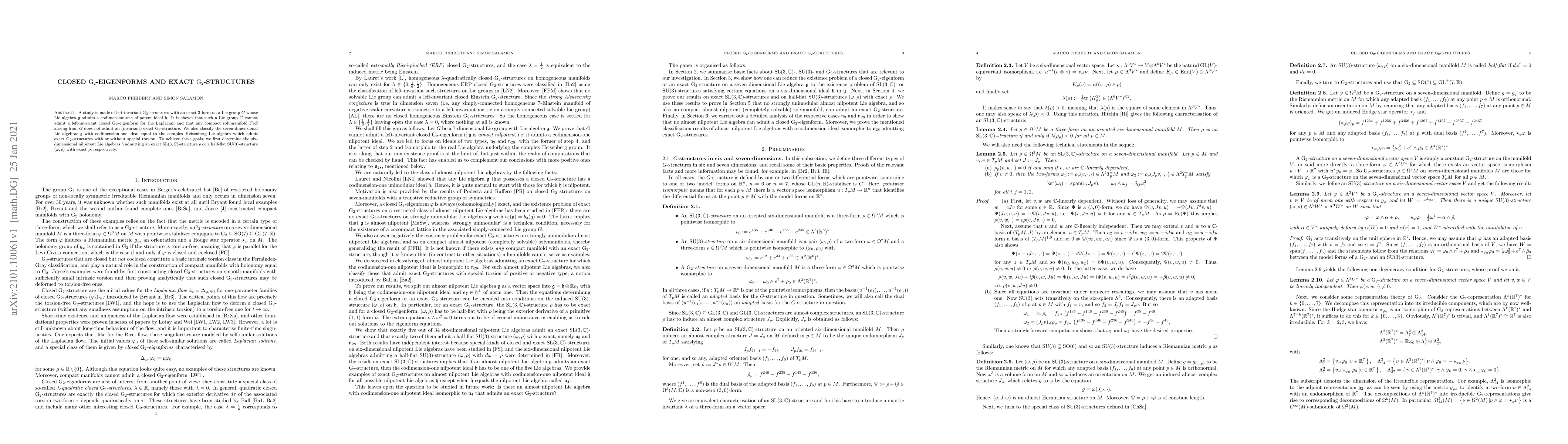 A study is made of left-invariant $\mathrm{G}_2$-structures with an exact 3-form on a Lie group $G$ whose Lie algebra $\mathfrak{g}$ admits a codimension-one nilpotent ideal $\mathfrak{h}$. It is shown that such a Lie group $G$ cannot admit a left-invariant closed $\mathrm{G}_2$-eigenform for the Laplacian and that any compact solvmanifold $\Gamma\backslash G$ arising from $G$ does not admit an (invariant) exact $\mathrm{G}_2$-structure. We also classify the seven-dimensional Lie algebras $\mathfrak{g}$ with codimension-one ideal equal to the complex Heisenberg Lie algebra which admit exact $\mathrm{G}_2$-structures with or without special torsion. To achieve these goals, we first determine the six-dimensional nilpotent Lie algebras $\mathfrak{h}$ admitting an exact $\mathrm{SL}(3,\mathbb{C})$-structure $\rho$ or a half-flat $\mathrm{SU}(3)$-structure $(\omega,\rho)$ with exact $\rho$, respectively.