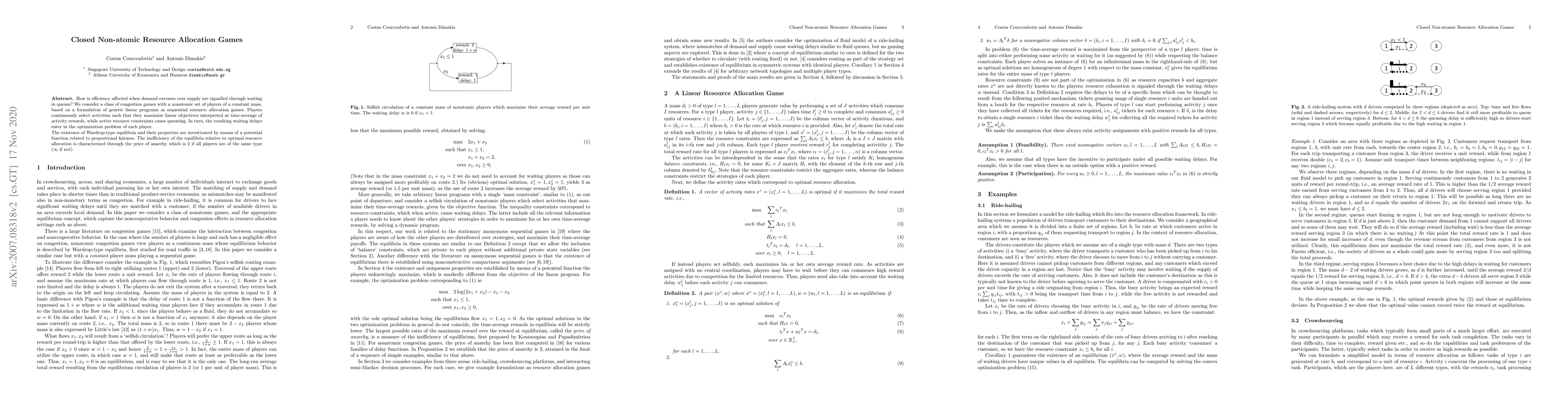 The paper introduces a potential function approach to analyze equilibrium properties in closed non-atomic resource allocation games, providing a characterization of Wardrop equilibria and their efficiency through the price of anarchy.
