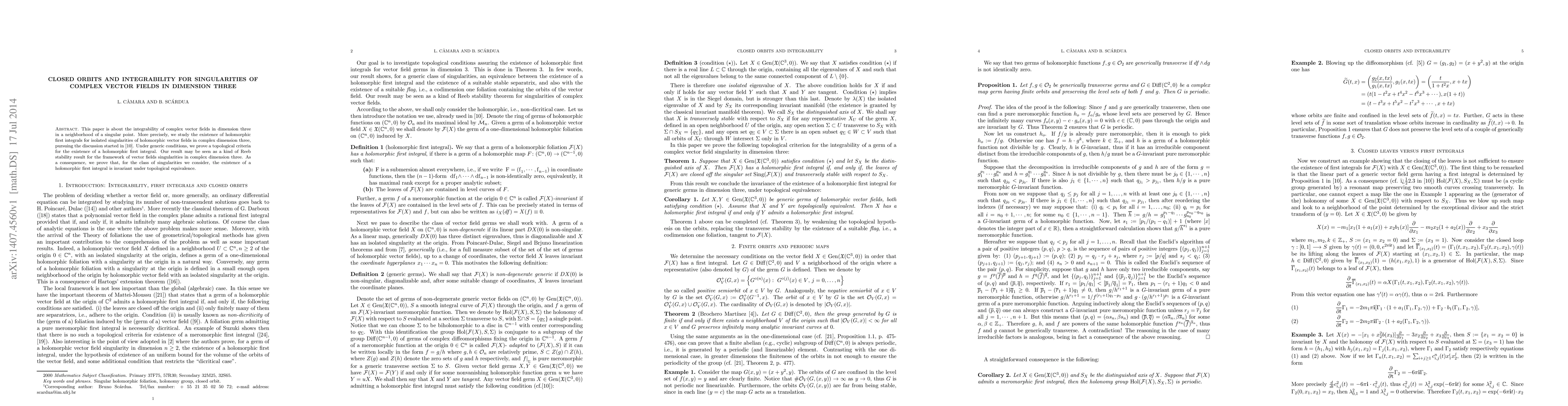 This paper investigates the integrability of complex vector fields in three dimensions near singular points, proving a topological criterion for the existence of holomorphic first integrals. It establishes the invariance under topological equivalence of such first integrals for a specific class of singularities.
