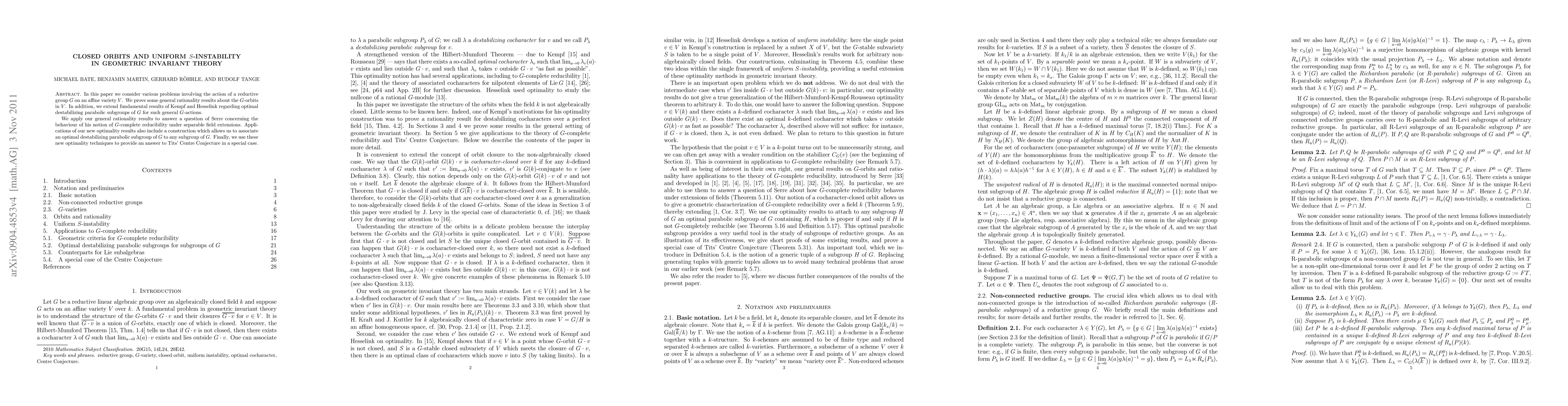 In this paper we consider various problems involving the action of a reductive group $G$ on an affine variety $V$. We prove some general rationality results about the $G$-orbits in $V$. In addition, we extend fundamental results of Kempf and Hesselink regarding optimal destabilizing parabolic subgroups of $G$ for such general $G$-actions. We apply our general rationality results to answer a question of Serre concerning the behaviour of his notion of $G$-complete reducibility under separable field extensions. Applications of our new optimality results also include a construction which allows us to associate an optimal destabilizing parabolic subgroup of $G$ to any subgroup of $G$. Finally, we use these new optimality techniques to provide an answer to Tits' Centre Conjecture in a special case.