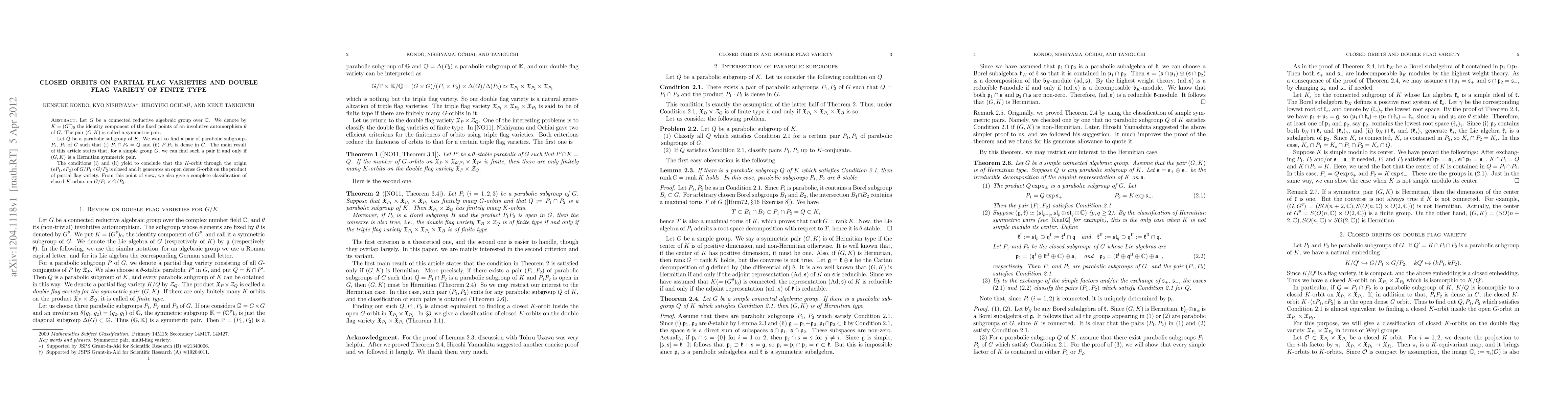 Let $ G $ be a connected reductive algebraic group over $ \C $. We denote by $ K = (G^{\theta})_{0} $ the identity component of the fixed points of an involutive automorphism $ \theta $ of $ G $. The pair $ (G, K) $ is called a symmetric pair. Let $Q$ be a parabolic subgroup of $K$. We want to find a pair of parabolic subgroups $P_{1}$, $P_{2}$ of $G$ such that (i) $P_{1} \cap P_{2} = Q$ and (ii) $P_{1} P_{2}$ is dense in $G$. The main result of this article states that, for a simple group $G$, we can find such a pair if and only if $(G, K)$ is a Hermitian symmetric pair. The conditions (i) and (ii) yield to conclude that the $K$-orbit through the origin $(e P_{1}, e P_{2})$ of $G/P_{1} \times G/P_{2}$ is closed and it generates an open dense $G$-orbit on the product of partial flag variety. From this point of view, we also give a complete classification of closed $K$-orbits on $G/P_{1} \times G/P_{2}$.