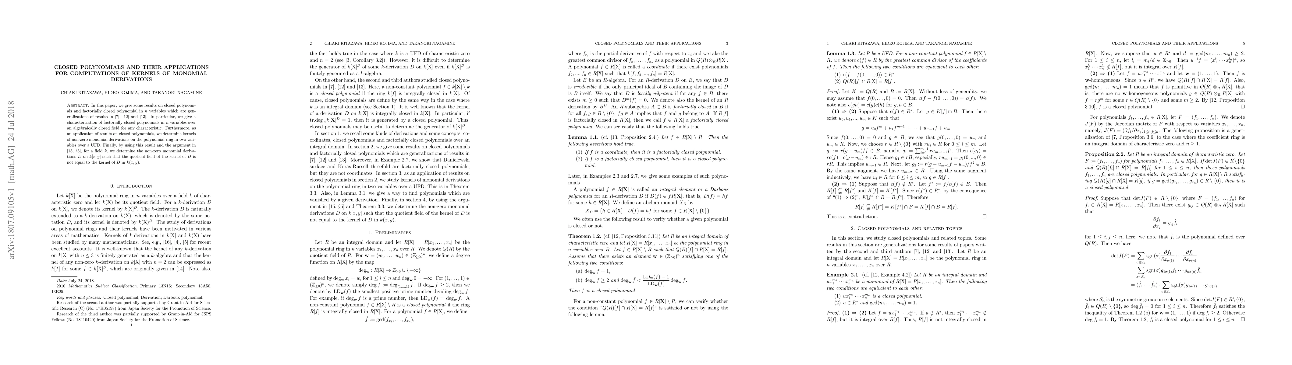 In this paper, we give some results on closed polynomials and factorially closed polynomial in $n$ variables. In particular, we give a characterization of factorially closed polynomials in $n$ variables over an algebraically closed field for any characteristic. Furthermore, as an application of results on closed polynomials, we determine kernels of non-zero monomial derivations on the polynomial ring in two variables over a UFD. Finally, by using this result, for a field $k$, we determine the non-zero monomial derivations $D$ on $k[x,y]$ such that the quotient field of the kernel of $D$ is not equal to the kernel of $D$ in $k(x,y)$.