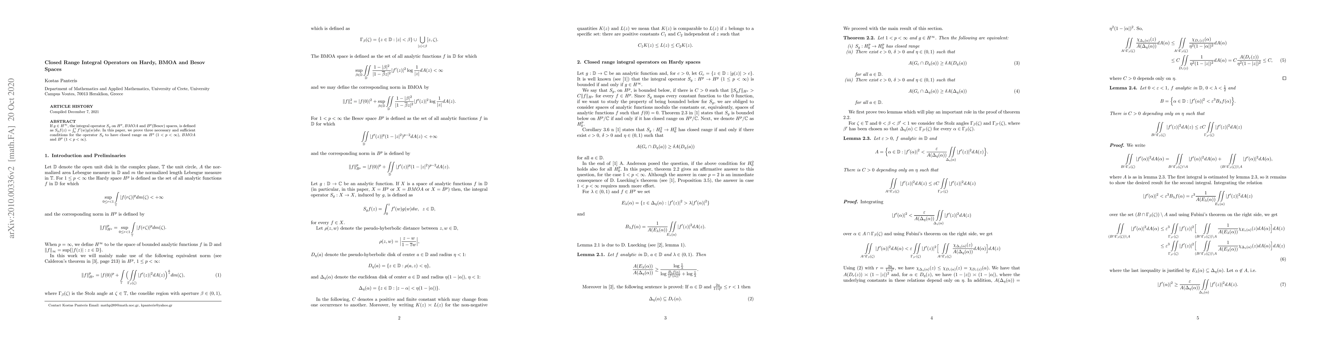 In this paper, we prove three necessary and sufficient conditions for the integral operator Sg to have closed range on Hardy Hp (1