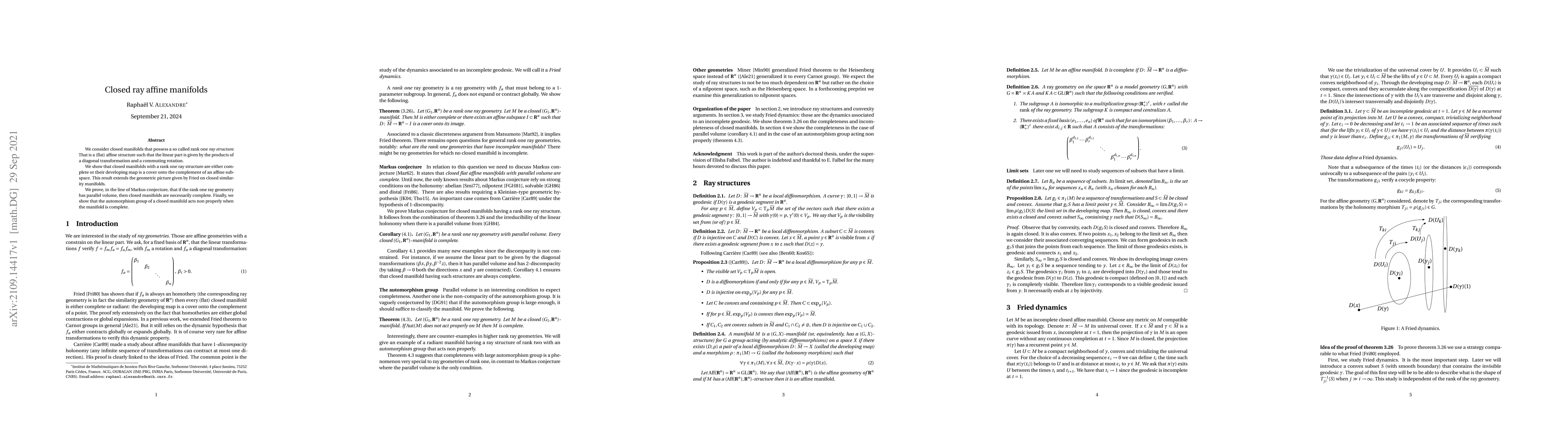 This paper explores closed manifolds with a rank one ray structure, demonstrating they are either complete or their developing map covers the complement of an affine subspace. It extends Fried's geometric insights on closed similarity manifolds and supports Markus's conjecture that complete manifolds with parallel volume must be complete. Additionally, it proves that the automorphism group of a complete manifold acts non-properly.