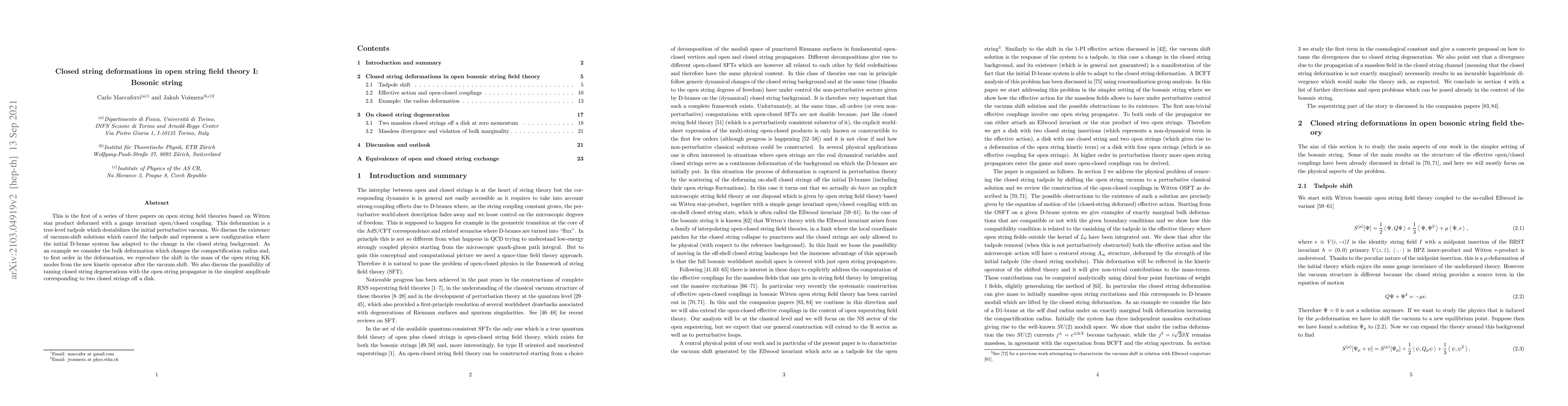 This is the first of a series of three papers on open string field theories based on Witten star product deformed with a gauge invariant open/closed coupling. This deformation is a tree-level tadpole which destabilizes the initial perturbative vacuum. We discuss the existence of vacuum-shift solutions which cancel the tadpole and represent a new configuration where the initial D-brane system has adapted to the change in the closed string background. As an example we consider the bulk deformation which changes the compactification radius and, to first order in the deformation, we reproduce the shift in the mass of the open string KK modes from the new kinetic operator after the vacuum shift. We also discuss the possibility of taming closed string degenerations with the open string propagator in the simplest amplitude corresponding to two closed strings off a disk.