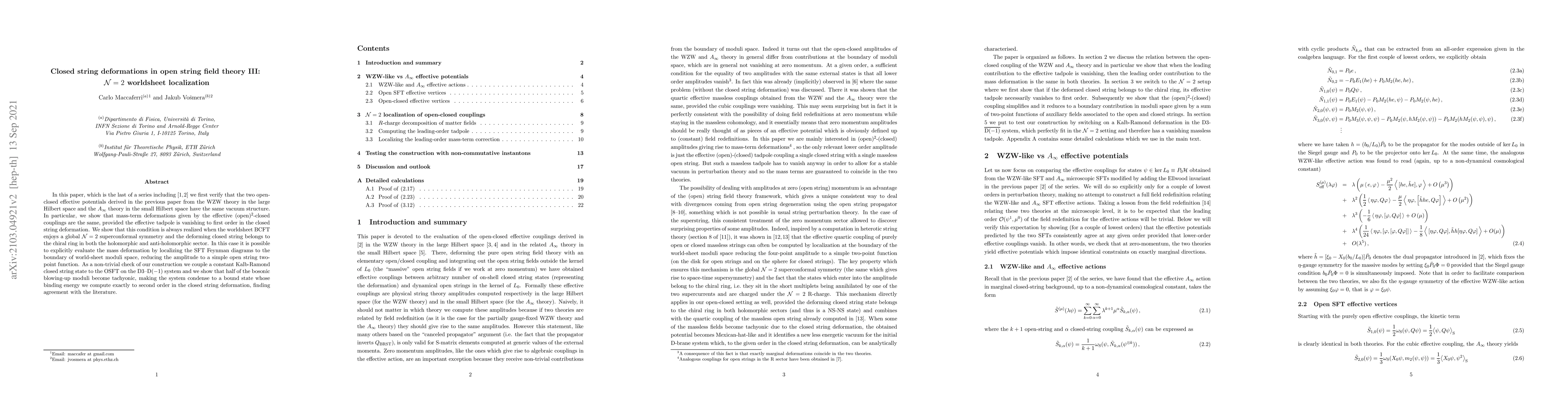 In this paper, which is the last of a series of three, we first verify that the two open-closed effective potentials derived in the previous paper from the WZW theory in the large Hilbert space and the $A_\infty$ theory in the small Hilbert space have the same vacuum structure. In particular, we show that mass-term deformations given by the effective (two open)-(one closed) couplings are the same, provided the effective tadpole is vanishing to first order in the closed string deformation. We show that this condition is always realized when the worldsheet BCFT enjoys a global ${\cal N}=2$ superconformal symmetry and the deforming closed string belongs to the chiral ring in both the holomorphic and anti-holomorphic sector. In this case it is possible to explicitly evaluate the mass deformation by localizing the SFT Feynman diagrams to the boundary of world-sheet moduli space, reducing the amplitude to a simple open string two-point function. As a non-trivial check of our construction we couple a constant Kalb-Ramond closed string state to the OSFT on the $\text{D}3$--$\text{D}(-1)$ system and we show that half of the bosonic blowing-up moduli become tachyonic, making the system condense to a bound state whose binding energy we compute exactly to second order in the closed string deformation, finding agreement with the literature.