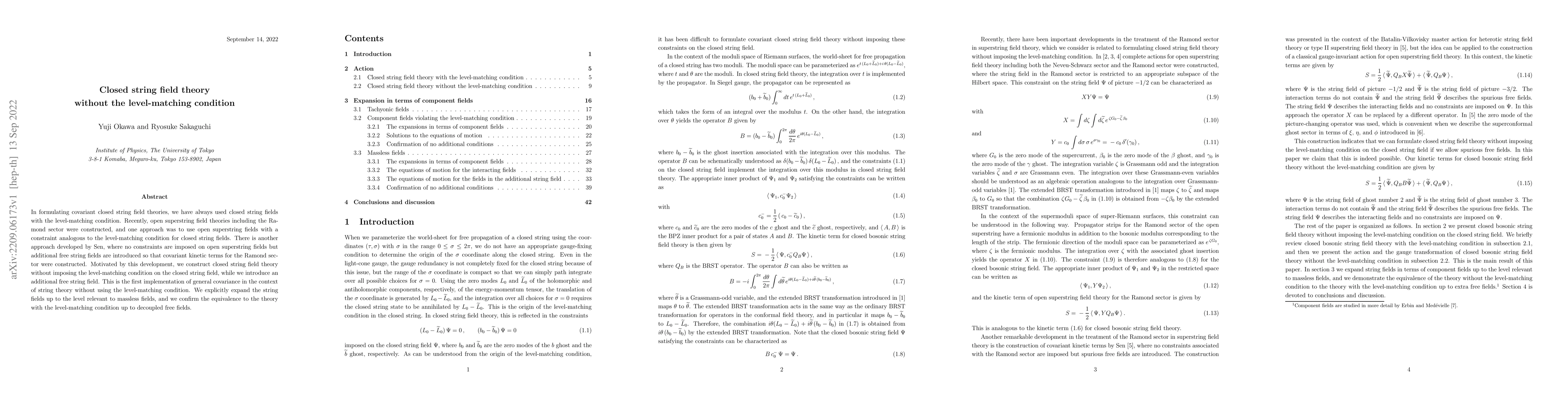 This paper constructs a covariant closed string field theory without imposing the level-matching condition, introducing an additional free string field. The authors demonstrate equivalence to the traditional theory with the level-matching condition, up to decoupled free fields, marking the first general covariant formulation without such constraints in string theory.