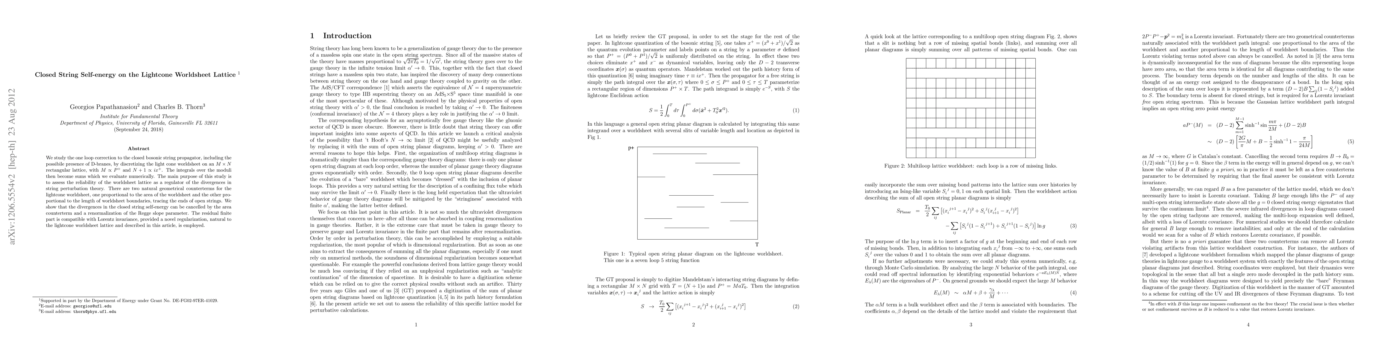 We study the one loop correction to the closed bosonic string propagator, including the possibile presence of D-branes, by discretizing the light cone worldsheet on an M times N rectangular lattice, with M proportional to P^+ and N+1 proportional to ix^+. The integrals over the moduli then become sums which we evaluate numerically. The main purpose of this study is to assess the reliability of the worldsheet lattice as a regulator of the divergences in string perturbation theory. There are two natural geometrical counterterms for the lightcone worldsheet, one proportional to the area of the worldsheet and the other proportional to the length of worldsheet boundaries, tracing the ends of open strings. We show that the divergences in the closed string self-energy can be cancelled by the area counterterm and a renormalization of the Regge slope parameter. The residual finite part is compatible with Lorentz invariance, provided a novel regularization, natural to the lightcone worldsheet lattice and described in this article, is employed.