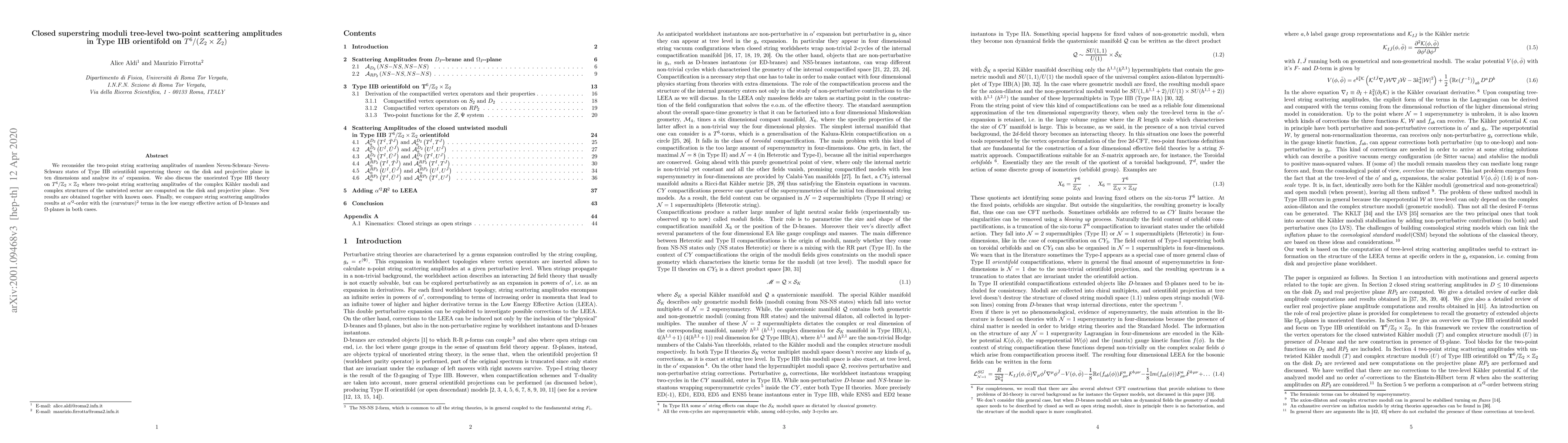 This paper investigates the tree-level two-point scattering amplitudes for massless Neveu-Schwarz-Neveu-Schwarz states in Type IIB orientifold superstring theory on $T^6/(Z_2\times Z_2)$, analyzing their $\alpha'$ expansion and comparing results with the effective action of D-branes and $\Omega$-planes. New and known results are presented for both the oriented and unoriented sectors.
