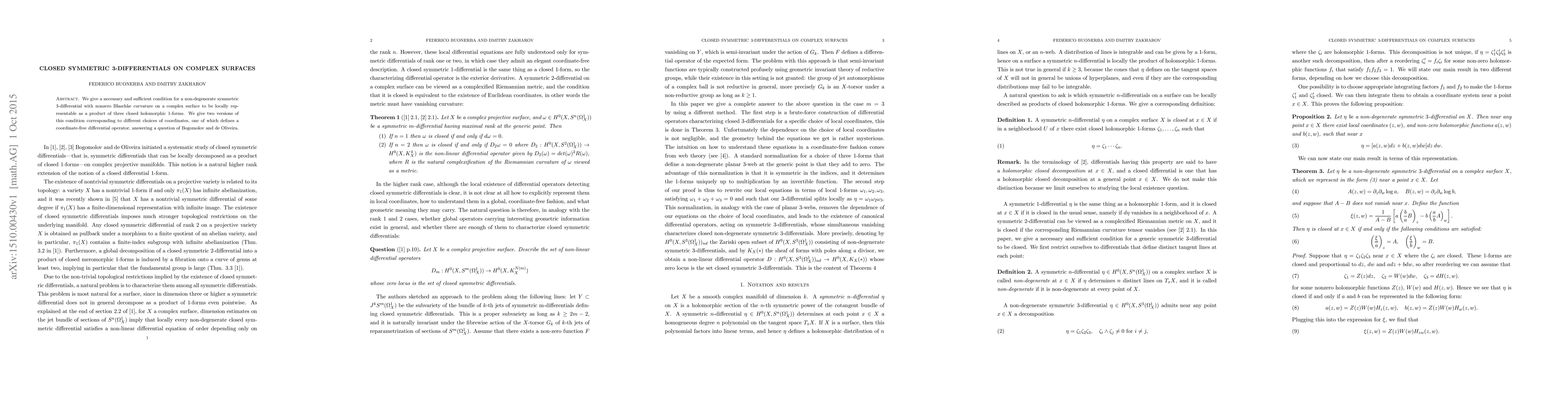 We give a necessary and sufficient condition for a non-degenerate symmetric 3-differential with nonzero Blaschke curvature on a complex surface to be locally representable as a product of three closed holomorphic 1-forms. We give two versions of this condition corresponding to different choices of coordinates, one of which defines a coordinate-free differential operator, answering a question of Bogomolov and de Oliveira.