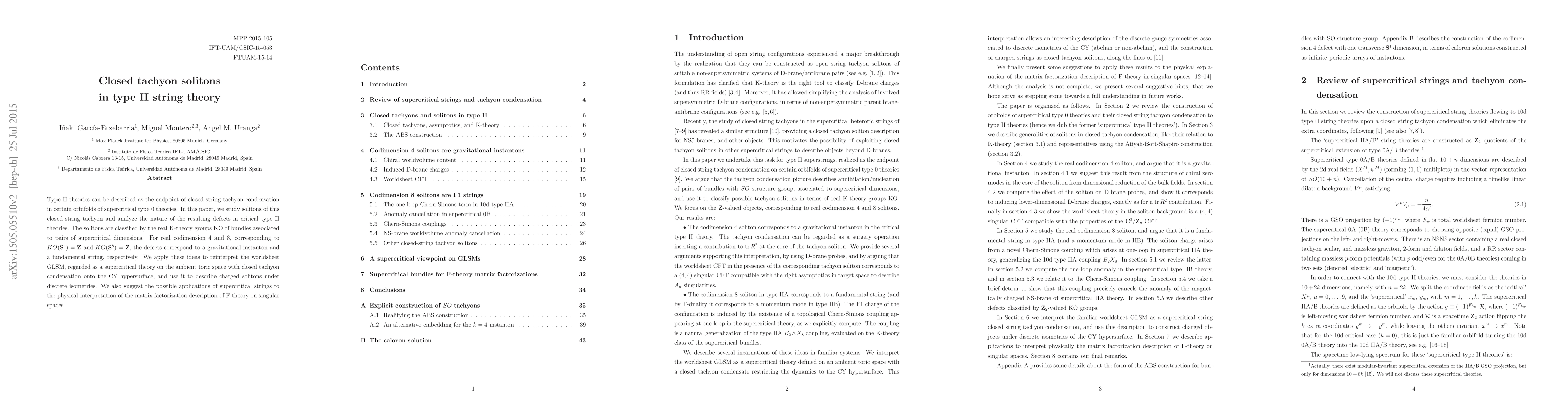 This paper investigates solitons arising from closed string tachyon condensation in type II string theory, classifying them by real K-theory groups and identifying gravitational instantons and fundamental strings. It also explores their implications for worldsheet GLSMs and the matrix factorization description of F-theory.