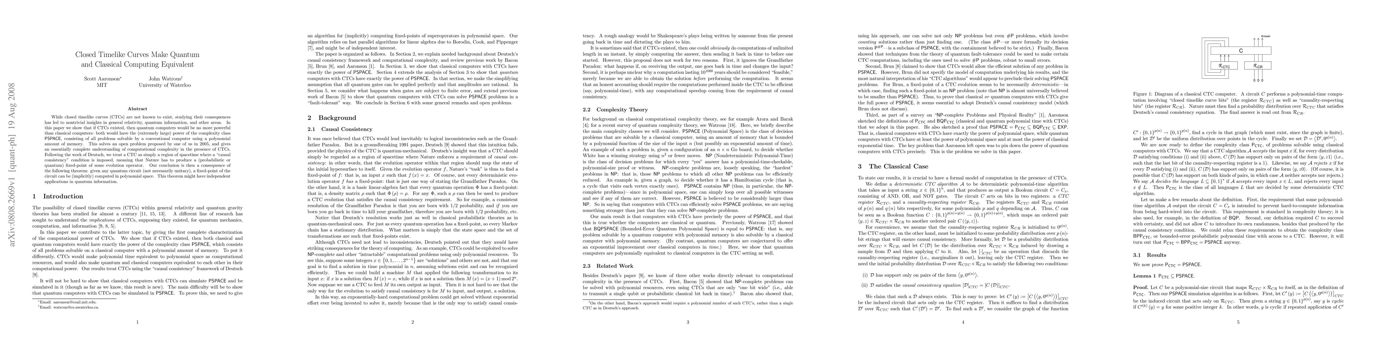 This paper demonstrates that if closed timelike curves (CTCs) existed, quantum computers would possess no greater computational power than classical computers, both being equivalent to PSPACE complexity class. The research resolves an open problem from 2005, treating CTCs as regions enforcing causal consistency. A key theorem states that fixed-points of any quantum circuit can be computed in polynomial space, suggesting potential applications in quantum information.