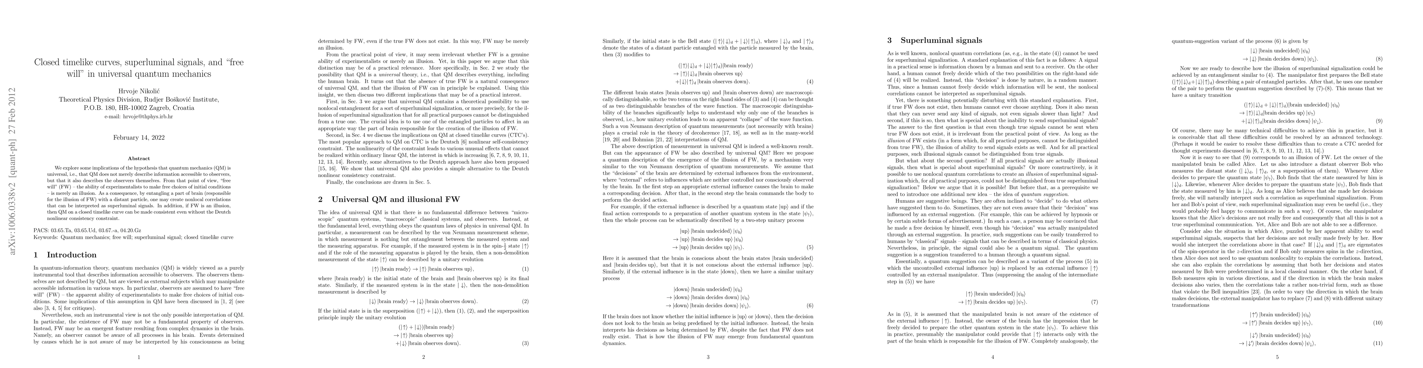 We explore some implications of the hypothesis that quantum mechanics (QM) is universal, i.e., that QM does not merely describe information accessible to observers, but that it also describes the observers themselves. From that point of view, "free will" (FW) - the ability of experimentalists to make free choices of initial conditions - is merely an illusion. As a consequence, by entangling a part of brain (responsible for the illusion of FW) with a distant particle, one may create nonlocal correlations that can be interpreted as superluminal signals. In addition, if FW is an illusion, then QM on a closed timelike curve can be made consistent even without the Deutch nonlinear consistency constraint.