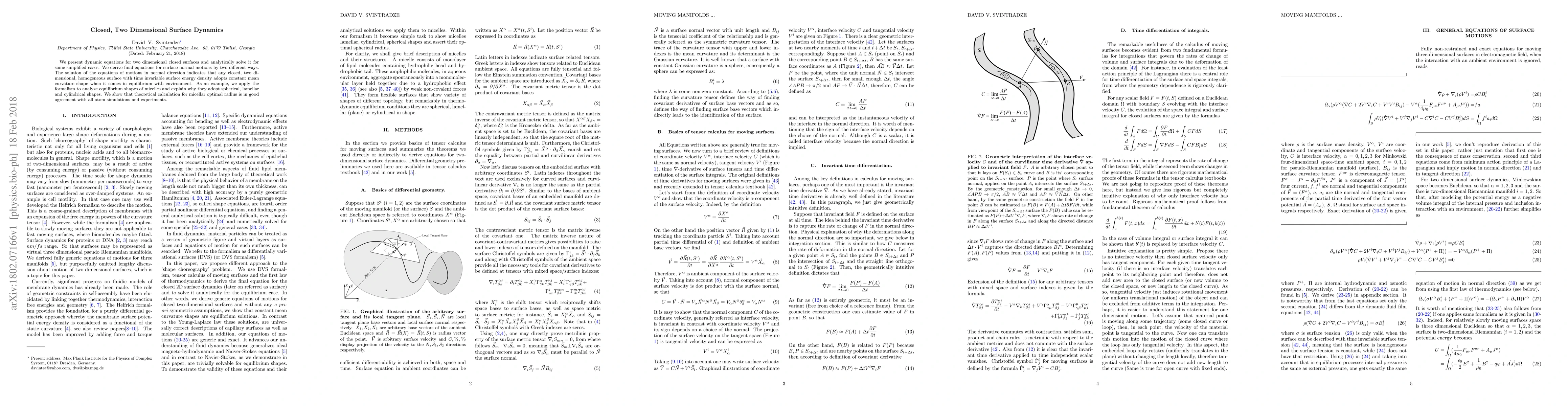 We present dynamic equations for two dimensional closed surfaces and analytically solve it for some simplified cases. We derive final equations for surface normal motions by two different ways. The solution of the equations of motions in normal direction indicates that any closed, two dimensional, homogeneous surface with time invariable surface energy density adopts constant mean curvature shape when it comes in equilibrium with environment. As an example, we apply the formalism to analyze equilibrium shapes of micelles and explain why they adopt spherical, lamellar and cylindrical shapes. We show that theoretical calculation for micellar optimal radius is in good agreement with all atom simulations and experiments.