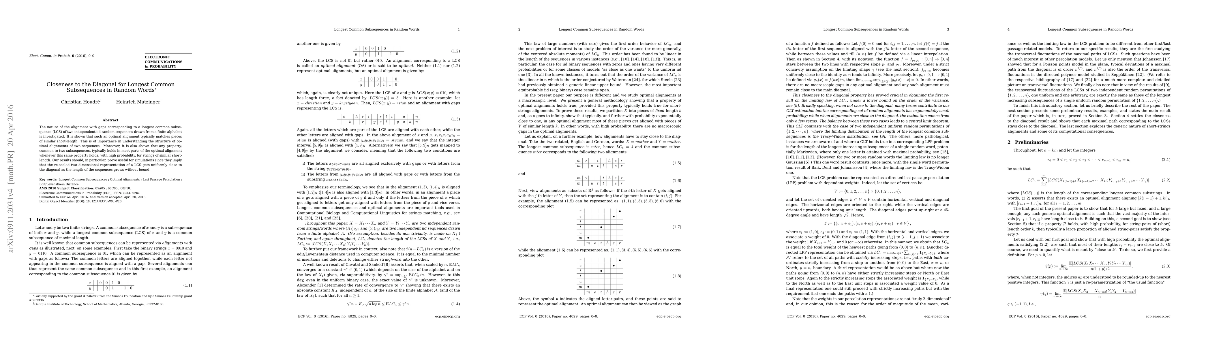 This paper investigates the alignment properties of longest common subsequences (LCS) in random sequences, showing that optimal alignments typically match pieces of similar short-length. It concludes that properties common to subsequences are likely to hold in most parts of the alignment, and that the re-scaled LCS representation approaches the diagonal as sequence length increases.