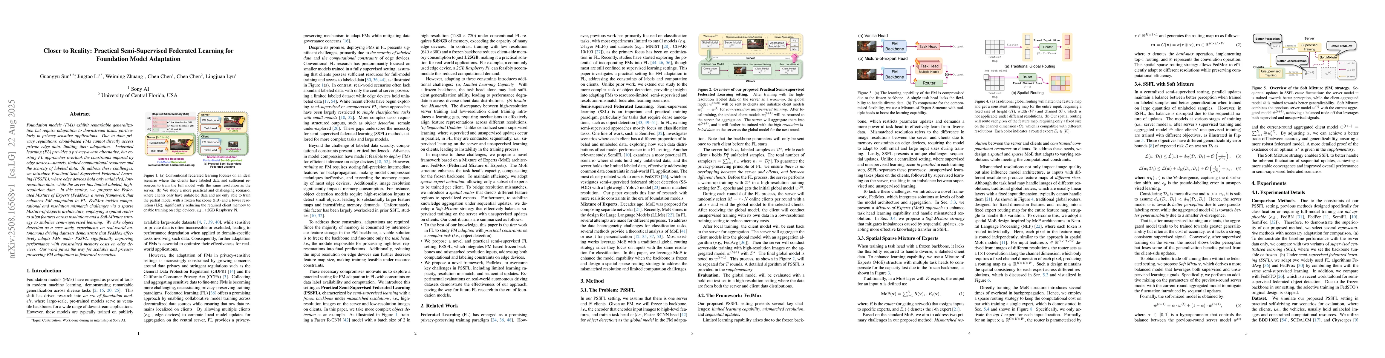 Foundation models (FMs) exhibit remarkable generalization but require adaptation to downstream tasks, particularly in privacy-sensitive applications. Due to data privacy regulations, cloud-based FMs cannot directly access private edge data, limiting their adaptation. Federated learning (FL) provides a privacy-aware alternative, but existing FL approaches overlook the constraints imposed by edge devices -- namely, limited computational resources and the scarcity of labeled data. To address these challenges, we introduce Practical Semi-Supervised Federated Learning (PSSFL), where edge devices hold only unlabeled, low-resolution data, while the server has limited labeled, high-resolution data. In this setting, we propose the Federated Mixture of Experts (FedMox), a novel framework that enhances FM adaptation in FL. FedMox tackles computational and resolution mismatch challenges via a sparse Mixture-of-Experts architecture, employing a spatial router to align features across resolutions and a Soft-Mixture strategy to stabilize semi-supervised learning. We take object detection as a case study, and experiments on real-world autonomous driving datasets demonstrate that FedMox effectively adapts FMs under PSSFL, significantly improving performance with constrained memory costs on edge devices. Our work paves the way for scalable and privacy-preserving FM adaptation in federated scenarios.
