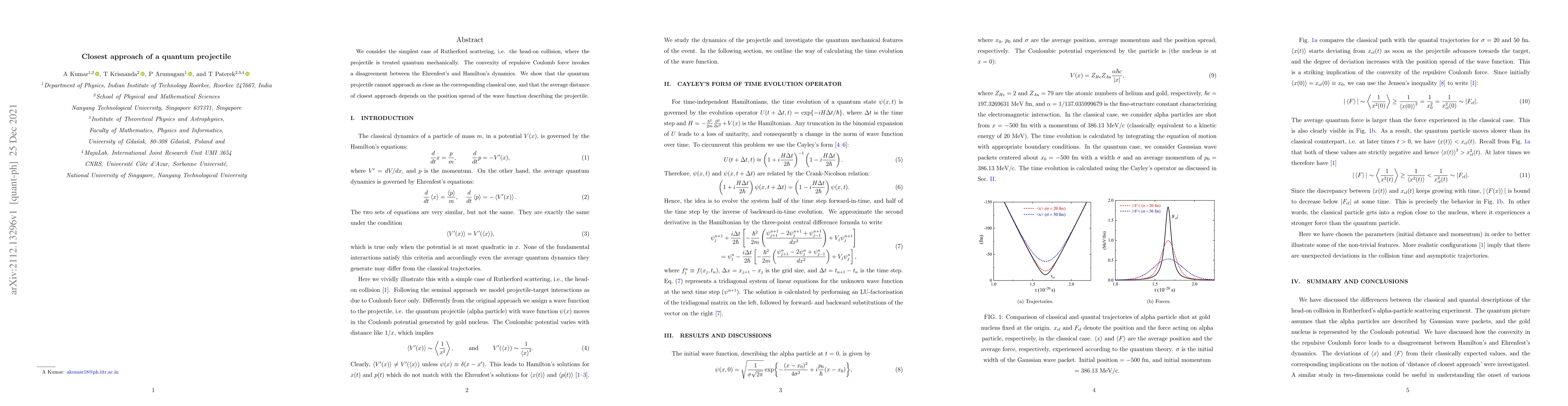 Summary: This paper examines quantum Rutherford scattering, revealing that the quantum projectile's average closest approach distance is greater than its classical counterpart due to the wave function's position spread, highlighting discrepancies between quantum and classical dynamics.
