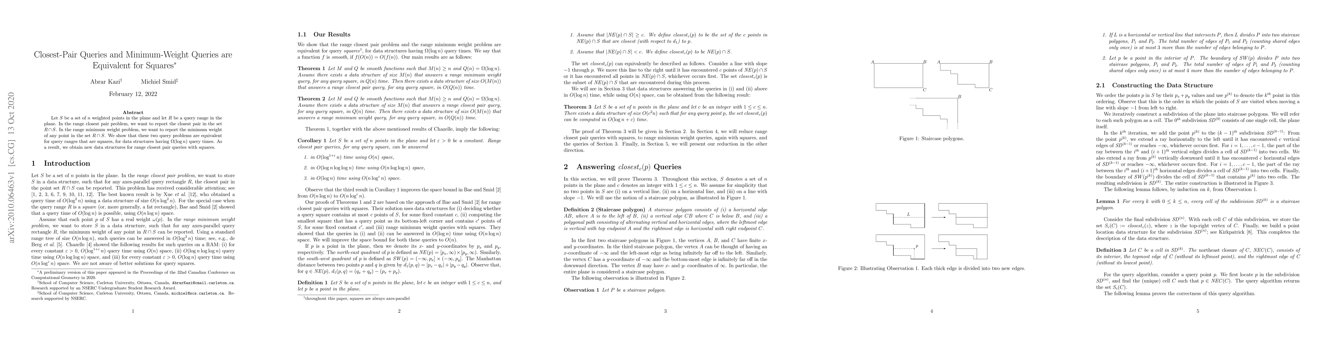 Two query problems for a set of points in the plane - closest pair and minimum weight queries - are equivalent when querying over square ranges, with data structures needing at least log(n) query times.