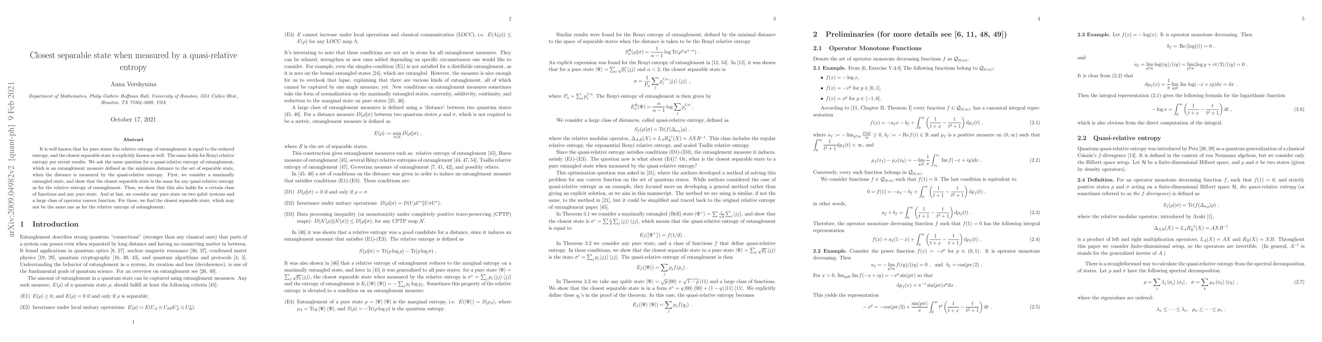 The paper explores quasi-relative entropy as an entanglement measure and finds that its closest separable state is the same as for relative entropy of entanglement in certain cases, but not always.