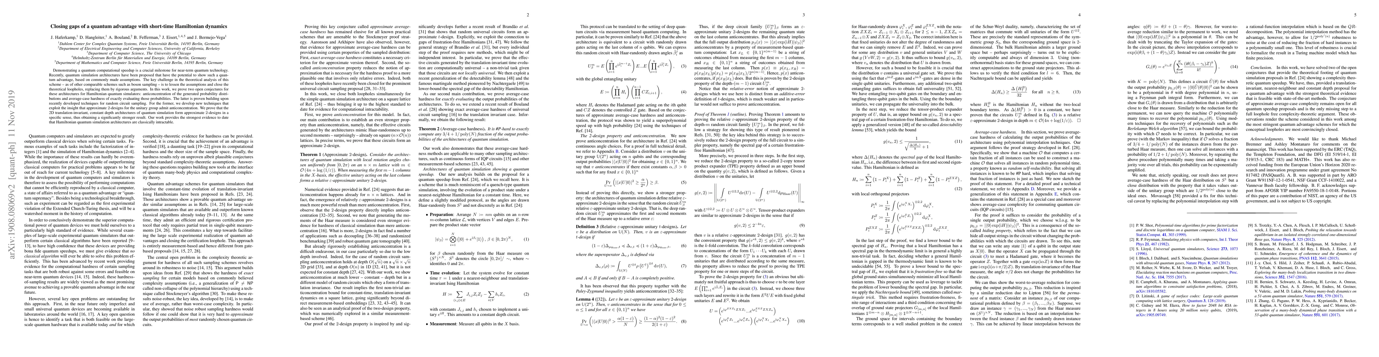 Demonstrating a quantum computational speedup is a crucial milestone for near-term quantum technology. Recently, quantum simulation architectures have been proposed that have the potential to show such a quantum advantage, based on commonly made assumptions. The key challenge in the theoretical analysis of this scheme - as of other comparable schemes such as boson sampling - is to lessen the assumptions and close the theoretical loopholes, replacing them by rigorous arguments. In this work, we prove two open conjectures for these architectures for Hamiltonian quantum simulators: Anticoncentration of the generated probability distributions and average-case hardness of exactly evaluating those probabilities. The latter is proven building upon recently developed techniques for random circuit sampling. For the former, we develop new techniques that exploit the insight that approximate 2-designs for the unitary group admit anticoncentration. We prove that the 2D translation-invariant, constant depth architectures of quantum simulation form approximate 2-designs in a specific sense, thus obtaining a significantly stronger result. Our work provides the strongest evidence to date that Hamiltonian quantum simulation architectures are classically intractable.
