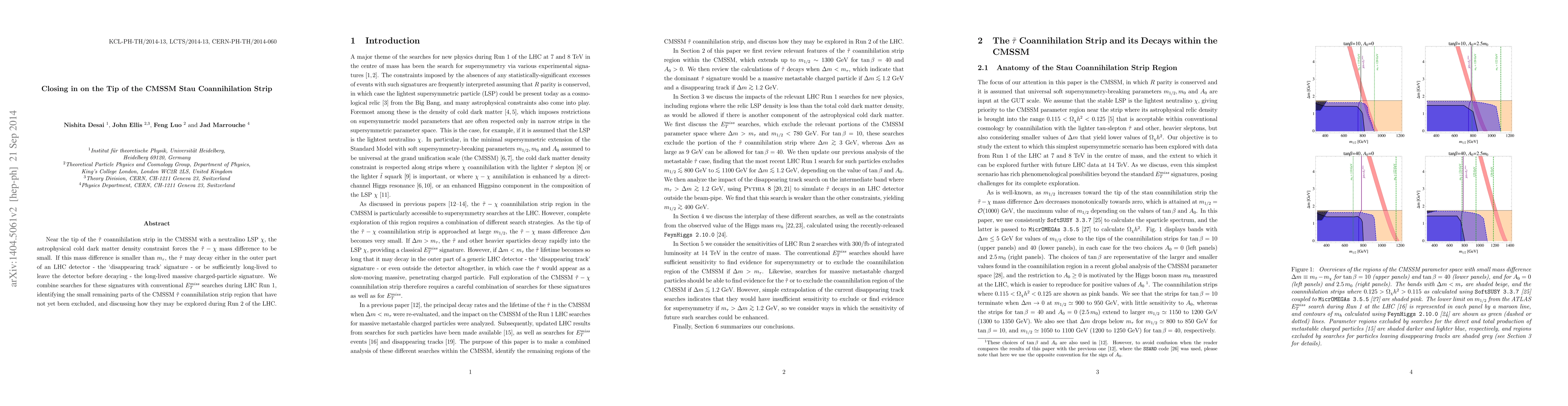 Near the tip of the stau coannihilation strip in the CMSSM with a neutralino LSP, the astrophysical cold dark matter density constraint forces the stau-neutralino mass difference to be small. If this mass difference is smaller than the tau mass, the stau may decay either in the outer part of an LHC detector - the `disappearing track' signature - or be sufficiently long-lived to leave the detector before decaying - the long-lived massive charged-particle signature. We combine searches for these signatures with conventional missing transverse energy searches during LHC Run 1, identifying the small remaining parts of the CMSSM stau coannihilation strip region that have not yet been excluded, and discussing how they may be explored during Run 2 of the LHC.