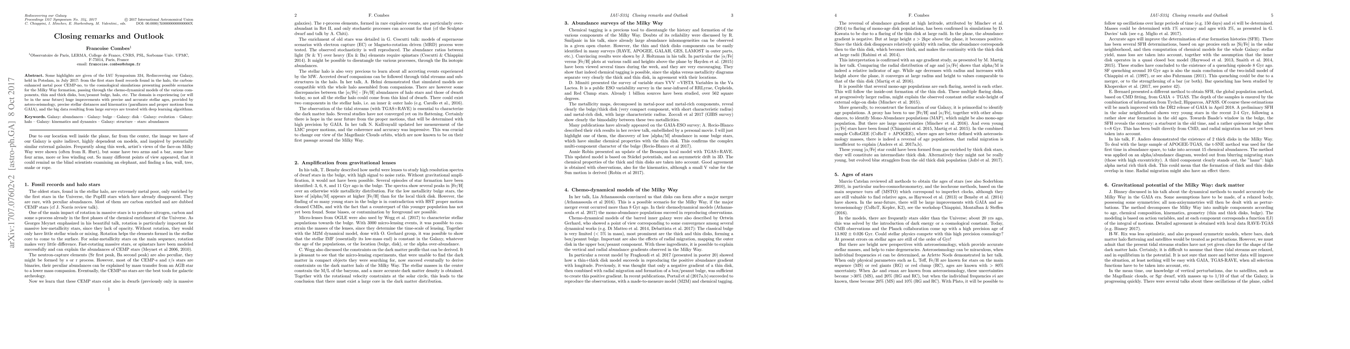 Some highlights are given of the IAU Symposium 334, Rediscovering our Galaxy, held in Potsdam, in July 2017: from the first stars fossil records found in the halo, the carbon-enhanced metal poor CEMP-no, to the cosmological simulations presenting possible scenarios for the Milky Way formation, passing through the chemo-dynamical models of the various components, thin and thick disks, box/peanut bulge, halo, etc. The domain is experiencing (or will be in the near future) huge improvements with precise and accurate stellar ages, provided by astero-seismology, precise stellar distances and kinematics (parallaxes and proper motions from GAIA), and the big data resulting from large surveys are treated with deep learning algorithms.