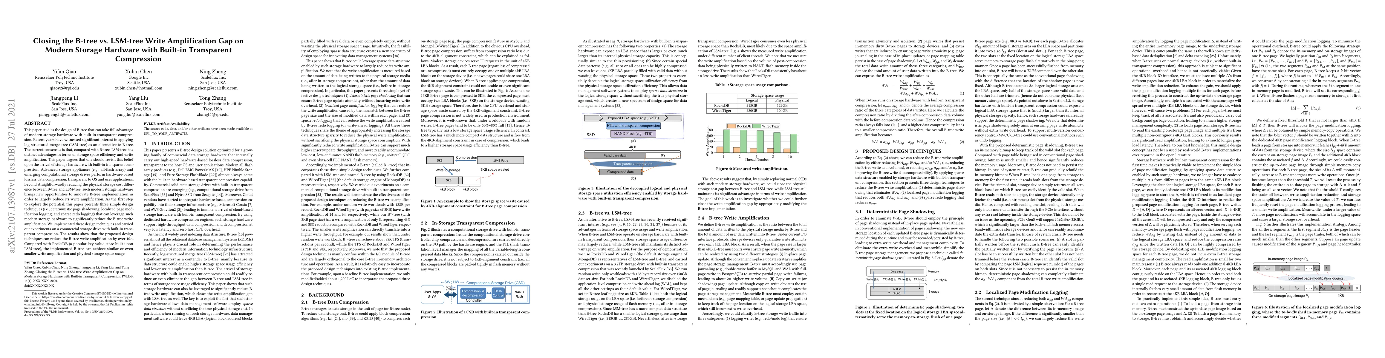 This paper proposes design techniques to reduce B-tree write amplification using modern storage hardware with built-in transparent compression, achieving similar or better performance compared to LSM-trees. The techniques include deterministic page shadowing, localized page modification logging, and sparse redo logging, leading to a significant reduction in write amplification.