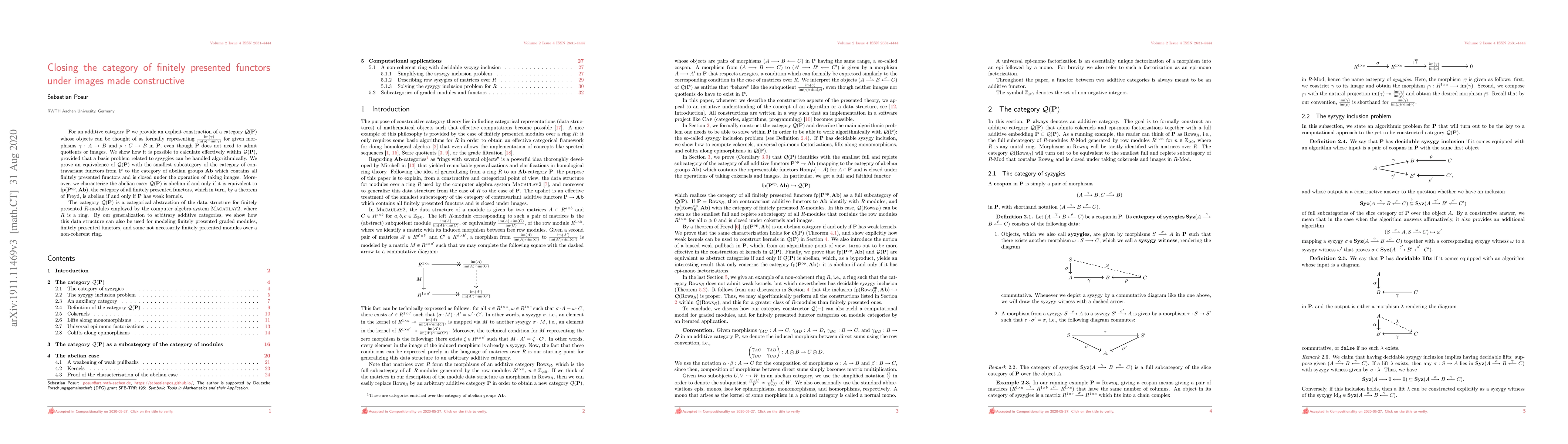For an additive category $\mathbf{P}$ we provide an explict construction of a category $\mathcal{Q}( \mathbf{P} )$ whose objects can be thought of as formally representing $\frac{\mathrm{im}( \gamma )}{\mathrm{im}( \rho ) \cap \mathrm{im}( \gamma )}$ for given morphisms $\gamma: A \rightarrow B$ and $\rho: C \rightarrow B$ in $\mathbf{P}$, even though $\mathbf{P}$ does not need to admit quotients or images. We show how it is possible to calculate effectively within $\mathcal{Q}( \mathbf{P} )$, provided that a basic problem related to syzygies can be handled algorithmically. We prove an equivalence of $\mathcal{Q}( \mathbf{P} )$ with the subcategory of the category of contravariant functors from $\mathbf{P}$ to the category of abelian groups $\mathbf{Ab}$ which contains all finitely presented functors and is closed under the operation of taking images. Moreover, we characterize the abelian case: $\mathcal{Q}( \mathbf{P} )$ is abelian if and only if it is equivalent to $\mathrm{fp}( \mathbf{P}^{\mathrm{op}}, \mathbf{Ab} )$, the category of all finitely presented functors, which in turn, by a theorem of Freyd, is abelian if and only if $\mathbf{P}$ has weak kernels. The category $\mathcal{Q}( \mathbf{P} )$ is a categorical abstraction of the data structure for finitely presented $R$-modules employed by the computer algebra system Macaulay2, where $R$ is a ring. By our generalization to arbitrary additive categories, we show how this data structure can also be used for modeling finitely presented graded modules, finitely presented functors, and some not necessarily finitely presented modules over a non-coherent ring.
