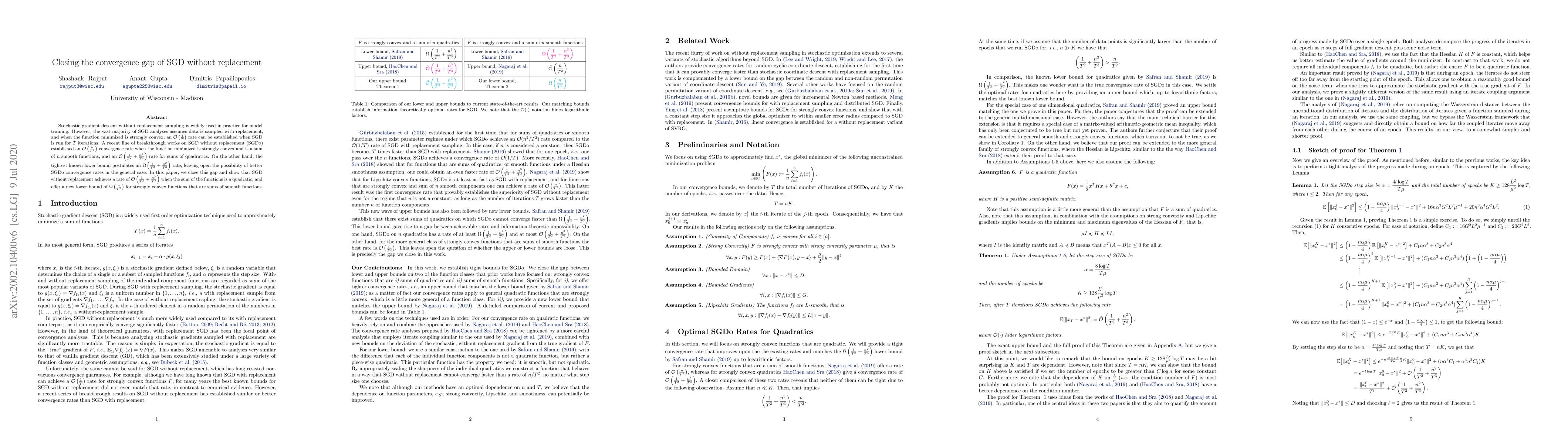 This paper closes the convergence rate gap for stochastic gradient descent without replacement (SGDo), showing it achieves an $\mathcal{O}\left(\frac{1}{T^2}+\frac{n^2}{T^3}\right)$ rate for quadratic sums, and provides a new lower bound of $\Omega\left(\frac{n}{T^2}\right)$ for strongly convex functions that are sums of smooth functions.