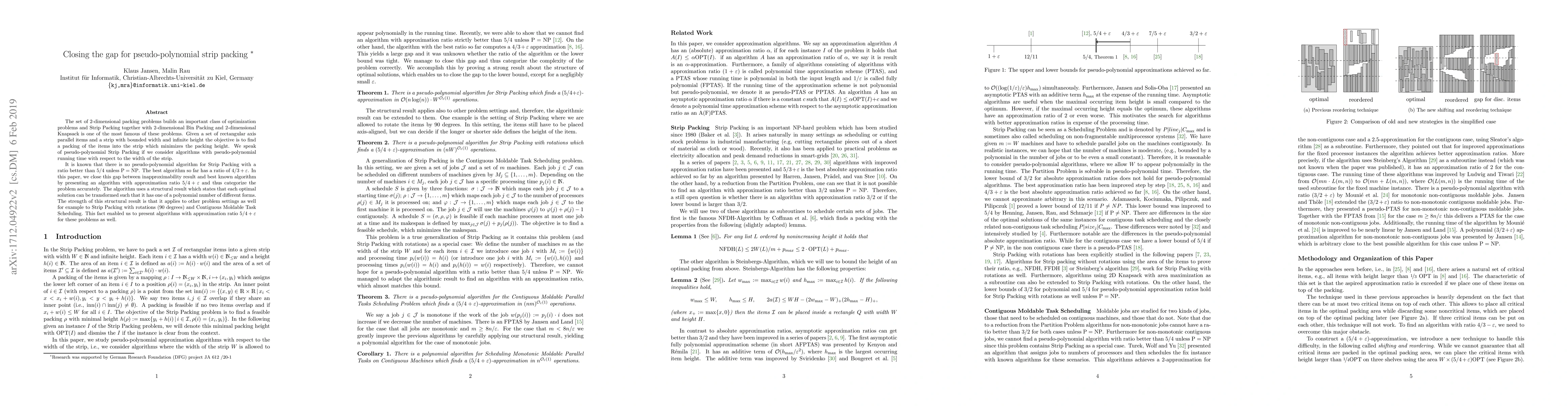The set of 2-dimensional packing problems builds an important class of optimization problems and Strip Packing together with 2-dimensional Bin Packing and 2-dimensional Knapsack is one of the most famous of these problems. Given a set of rectangular axis parallel items and a strip with bounded width and infinite height the objective is to find a packing of the items into the strip which minimizes the packing height. We speak of pseudo-polynomial Strip Packing if we consider algorithms with pseudo-polynomial running time with respect to the width of the strip. It is known that there is no pseudo-polynomial algorithm for Strip Packing with a ratio better than $5/4$ unless $\mathrm{P} = \mathrm{NP}$. The best algorithm so far has a ratio of $(4/3 + \varepsilon)$. In this paper, we close this gap between inapproximability result and best known algorithm by presenting an algorithm with approximation ratio $(5/4 + \varepsilon)$ and thus categorize the problem accurately. The algorithm uses a structural result which states that each optimal solution can be transformed such that it has one of a polynomial number of different forms. The strength of this structural result is that it applies to other problem settings as well for example to Strip Packing with rotations (90 degrees) and Contiguous Moldable Task Scheduling. This fact enabled us to present algorithms with approximation ratio $(5/4 + \varepsilon)$ for these problems as well.