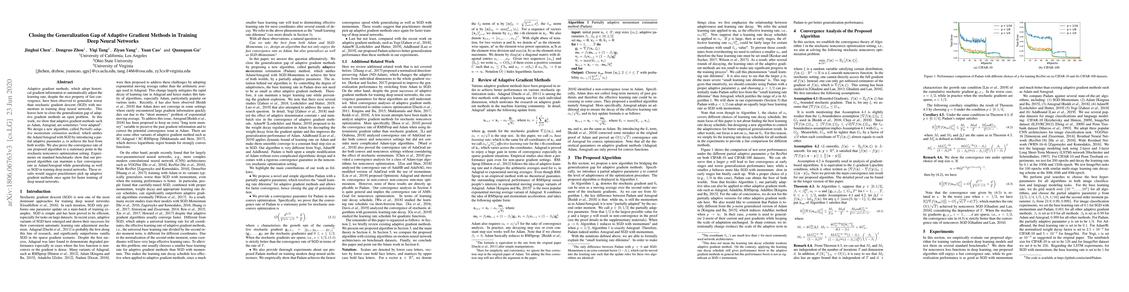 This paper proposes a new adaptive gradient method called Partially adaptive momentum estimation method (PAME) that combines the fast convergence of Adam/Amsgrad with the better generalization of SGD, closing the generalization gap. The algorithm introduces a partial adaptive parameter to achieve optimal performance, and experiments show it maintains fast convergence while generalizing as well as SGD.