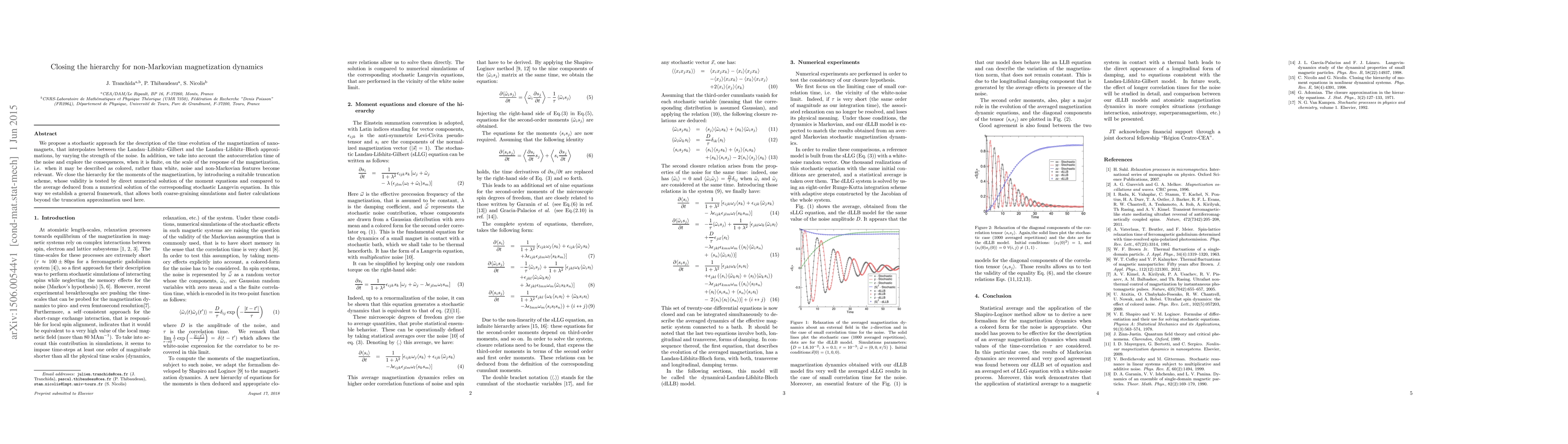 We propose a stochastic approach for the description of the time evolution of the magnetization of nanomagnets, that interpolates between the Landau--Lifshitz--Gilbert and the Landau--Lifshitz--Bloch approximations, by varying the strength of the noise. In addition, we take into account the autocorrelation time of the noise and explore the consequences, when it is finite, on the scale of the response of the magnetization, i.e. when it may be described as colored, rather than white, noise and non-Markovian features become relevant. We close the hierarchy for the moments of the magnetization, by introducing a suitable truncation scheme, whose validity is tested by direct numerical solution of the moment equations and compared to the average deduced from a numerical solution of the corresponding stochastic Langevin equation. In this way we establish a general framework, that allows both coarse-graining simulations and faster calculations beyond the truncation approximation used here.