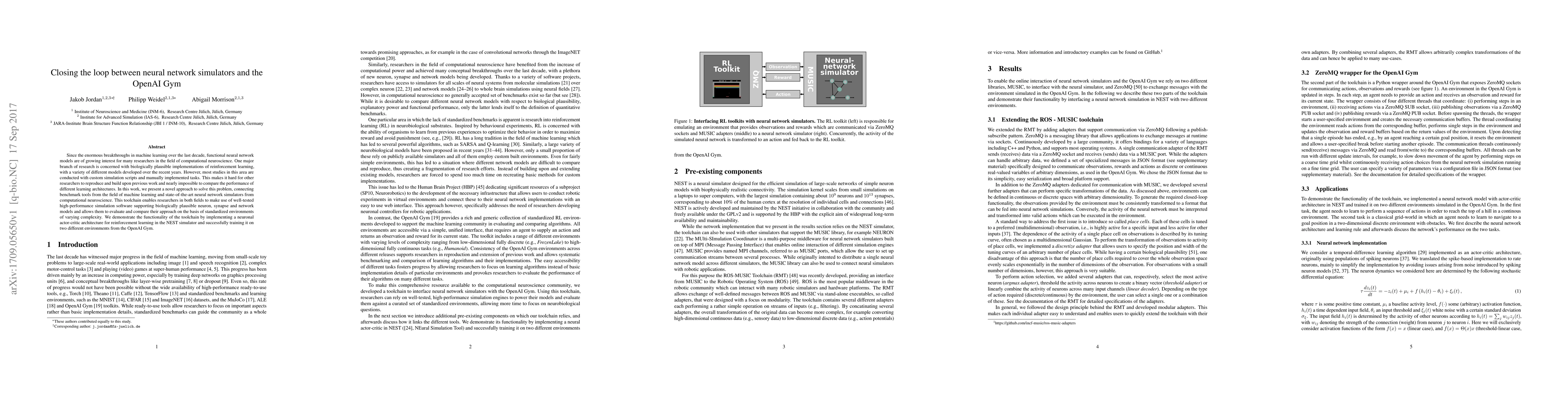 Since the enormous breakthroughs in machine learning over the last decade, functional neural network models are of growing interest for many researchers in the field of computational neuroscience. One major branch of research is concerned with biologically plausible implementations of reinforcement learning, with a variety of different models developed over the recent years. However, most studies in this area are conducted with custom simulation scripts and manually implemented tasks. This makes it hard for other researchers to reproduce and build upon previous work and nearly impossible to compare the performance of different learning architectures. In this work, we present a novel approach to solve this problem, connecting benchmark tools from the field of machine learning and state-of-the-art neural network simulators from computational neuroscience. This toolchain enables researchers in both fields to make use of well-tested high-performance simulation software supporting biologically plausible neuron, synapse and network models and allows them to evaluate and compare their approach on the basis of standardized environments of varying complexity. We demonstrate the functionality of the toolchain by implementing a neuronal actor-critic architecture for reinforcement learning in the NEST simulator and successfully training it on two different environments from the OpenAI Gym.