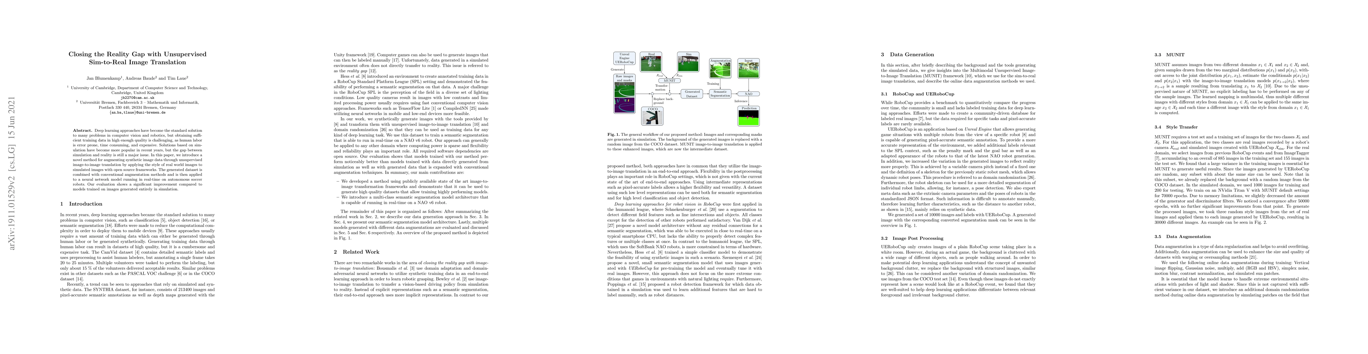 Deep learning approaches have become the standard solution to many problems in computer vision and robotics, but obtaining sufficient training data in high enough quality is challenging, as human labor is error prone, time consuming, and expensive. Solutions based on simulation have become more popular in recent years, but the gap between simulation and reality is still a major issue. In this paper, we introduce a novel method for augmenting synthetic image data through unsupervised image-to-image translation by applying the style of real world images to simulated images with open source frameworks. The generated dataset is combined with conventional augmentation methods and is then applied to a neural network model running in real-time on autonomous soccer robots. Our evaluation shows a significant improvement compared to models trained on images generated entirely in simulation.