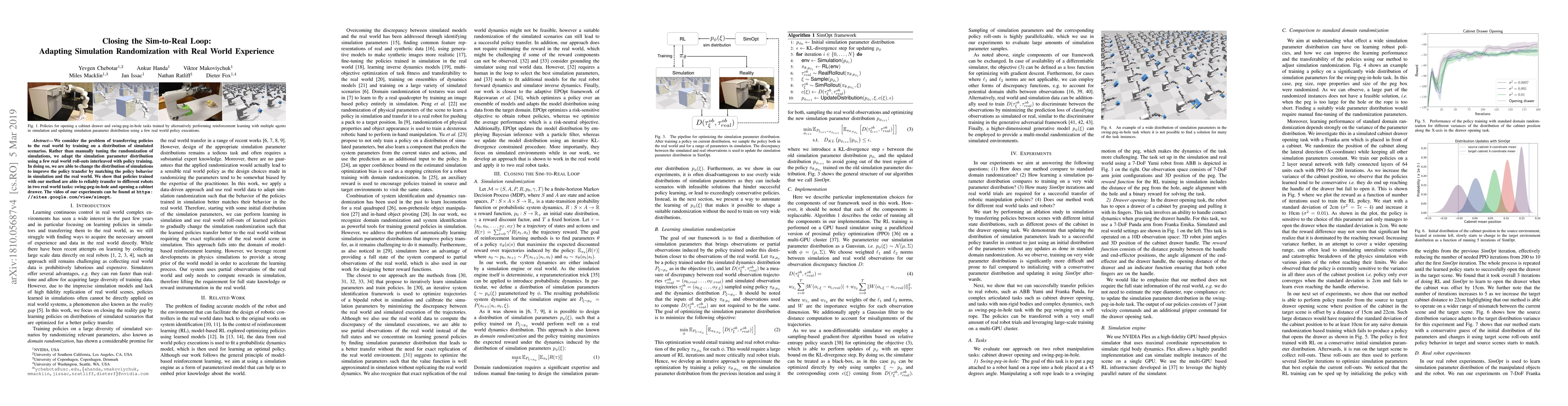 This paper proposes an adaptive method to improve policy transfer from simulation to real-world robots by dynamically adjusting simulation parameters based on real-world experience. The method enhances policy performance by aligning simulated and real-world behaviors, demonstrated effectively in swing-peg-in-hole and cabinet drawer opening tasks.