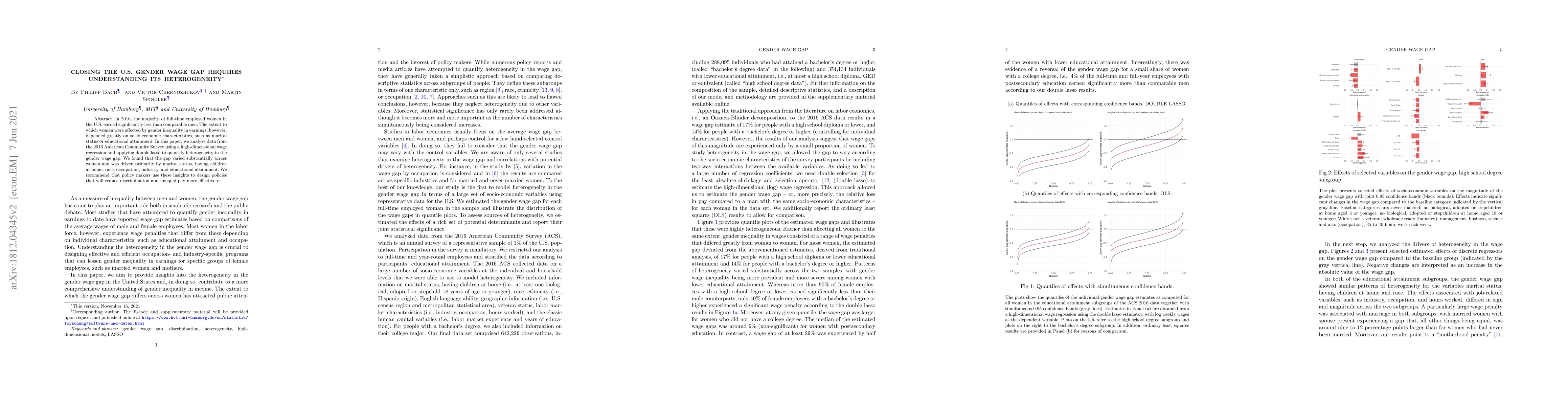 In 2016, the majority of full-time employed women in the U.S. earned significantly less than comparable men. The extent to which women were affected by gender inequality in earnings, however, depended greatly on socio-economic characteristics, such as marital status or educational attainment. In this paper, we analyzed data from the 2016 American Community Survey using a high-dimensional wage regression and applying double lasso to quantify heterogeneity in the gender wage gap. We found that the gap varied substantially across women and was driven primarily by marital status, having children at home, race, occupation, industry, and educational attainment. We recommend that policy makers use these insights to design policies that will reduce discrimination and unequal pay more effectively.