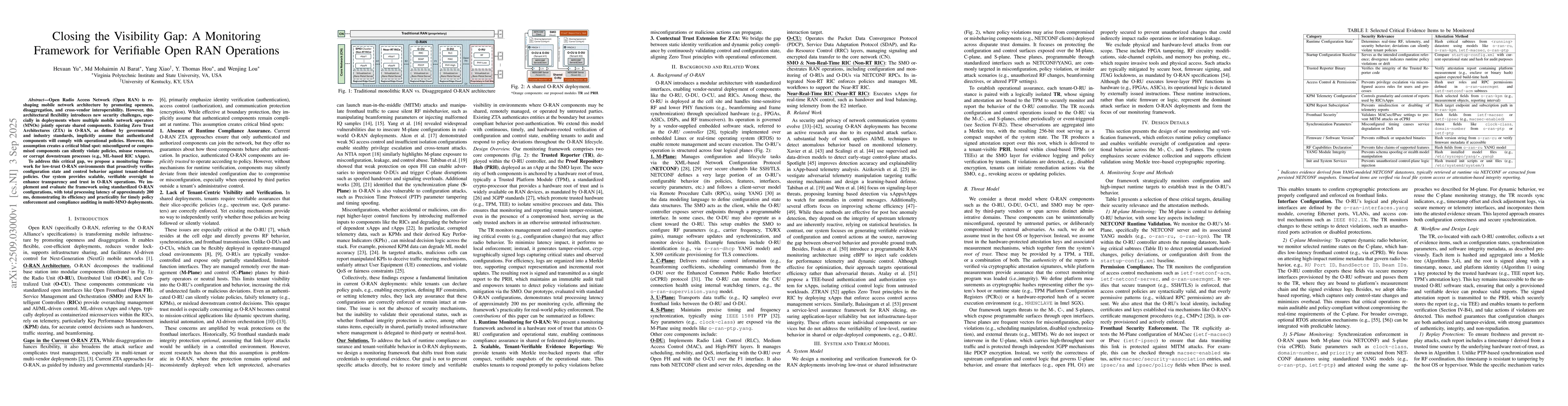 Open Radio Access Network (Open RAN) is reshaping mobile network architecture by promoting openness, disaggregation, and cross-vendor interoperability. However, this architectural flexibility introduces new security challenges, especially in deployments where multiple mobile network operators (MNOs) jointly operate shared components. Existing Zero Trust Architectures (ZTA) in O-RAN, as defined by governmental and industry standards, implicitly assume that authenticated components will comply with operational policies. However, this assumption creates a critical blind spot: misconfigured or compromised components can silently violate policies, misuse resources, or corrupt downstream processes (e.g., ML-based RIC xApps). To address this critical gap, we propose a monitoring framework for low-trust O-RAN environments that proactively verifies configuration state and control behavior against tenant-defined policies. Our system provides scalable, verifiable oversight to enhance transparency and trust in O-RAN operations. We implement and evaluate the framework using standardized O-RAN configurations, with total processing latency of approximately 200 ms, demonstrating its efficiency and practicality for timely policy enforcement and compliance auditing in multi-MNO deployments.