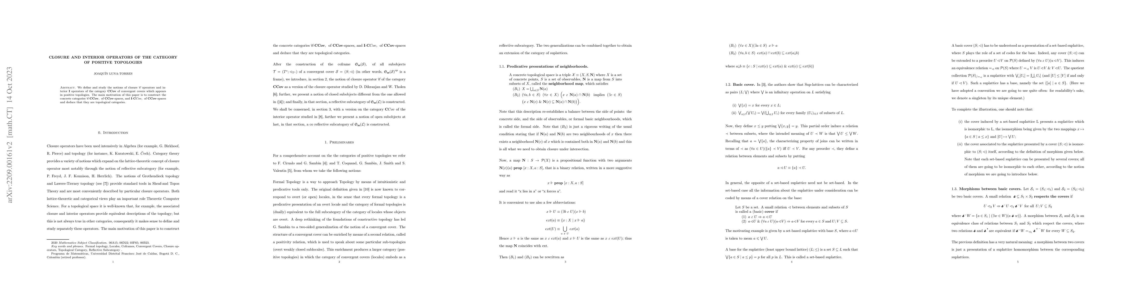 This paper defines closure and interior operators in the category of convergent covers in positive topologies, constructs the categories $\mathbf{\text{C-}CCov}$ and $\mathbf{I-CCov}$ of $\mathbf{CCov}$-spaces, and proves that these categories are topological.