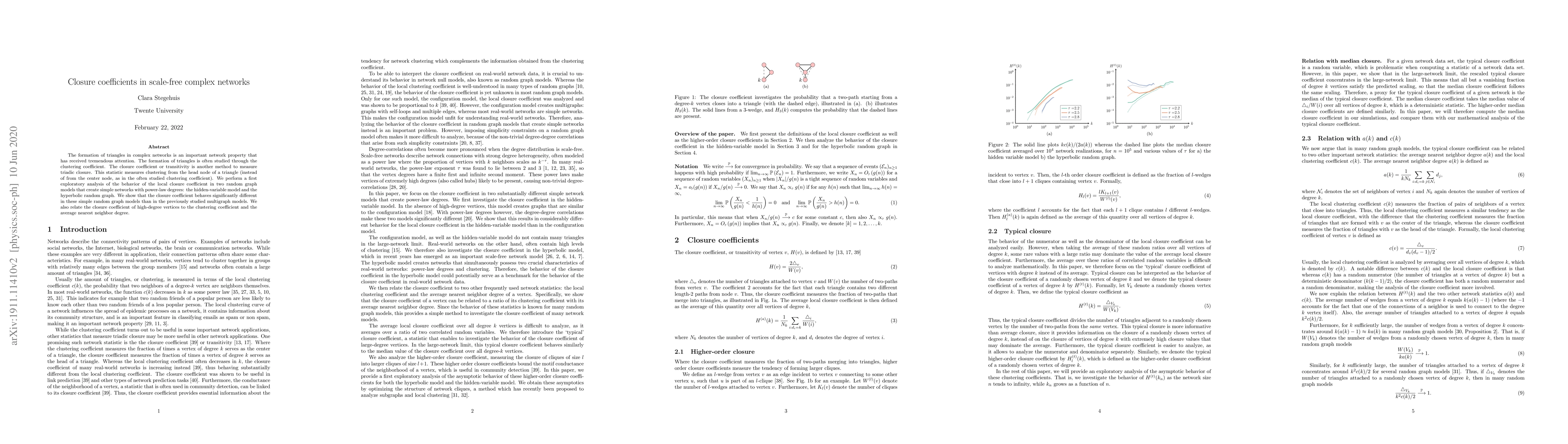 Researchers analyzed closure coefficients in scale-free complex networks, finding they behave differently in simple graph models compared to previously studied multigraph models, and relate it to clustering and nearest neighbor degrees.
