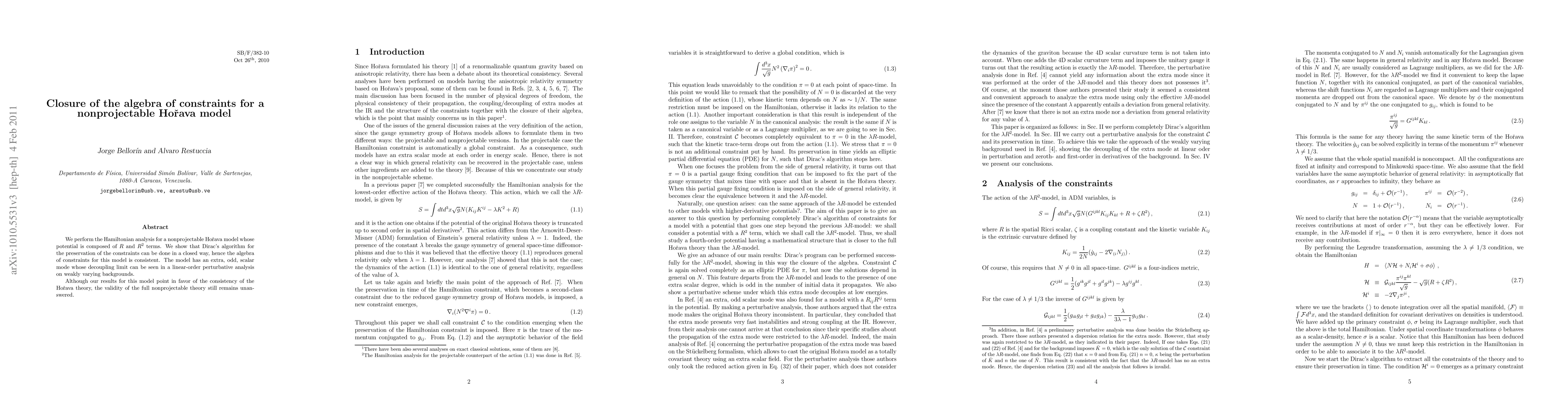 We perform the Hamiltonian analysis for a nonprojectable Horava model whose potential is composed of R and R^2 terms. We show that Dirac's algorithm for the preservation of the constraints can be done in a closed way, hence the algebra of constraints for this model is consistent. The model has an extra, odd, scalar mode whose decoupling limit can be seen in a linear-order perturbative analysis on weakly varying backgrounds. Although our results for this model point in favor of the consistency of the Ho\v{r}ava theory, the validity of the full nonprojectable theory still remains unanswered.