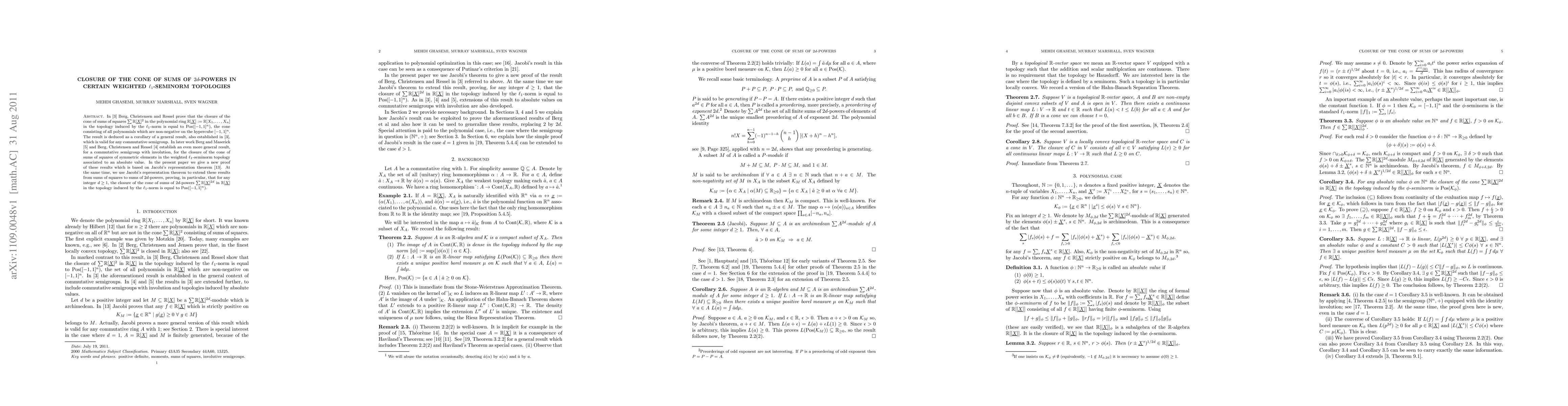 Berg, Christensen and Ressel prove that the closure of the cone of sums of squares in the ring of real polynomials in the topology induced by the $\ell_1$-norm is equal to the cone consisting of all polynomials which are non-negative on the hypercube $[-1,1]^n$. The result is deduced as a corollary of a general result which is valid for any commutative semigroup. In later work Berg and Maserick and also Berg, Christensen and Ressel establish an even more general result, for a commutative semigroup with involution, for the closure of the cone of sums of squares of symmetric elements in the weighted $\ell_1$-seminorm topology associated to an absolute value. In the present paper we give a new proof of these results which is based on Jacobi's representation theorem. At the same time, we use Jacobi's representation theorem to extend these results from sums of squares to sums of 2d-powers, proving, in particular, that for any integer $d>0$, the closure of the cone of sums of 2d-powers in the ring of real polynomials in the topology induced by the $\ell_1$-norm is equal the cone consisting of all polynomials which are non-negative on the hypercube $[-1,1]^n$.