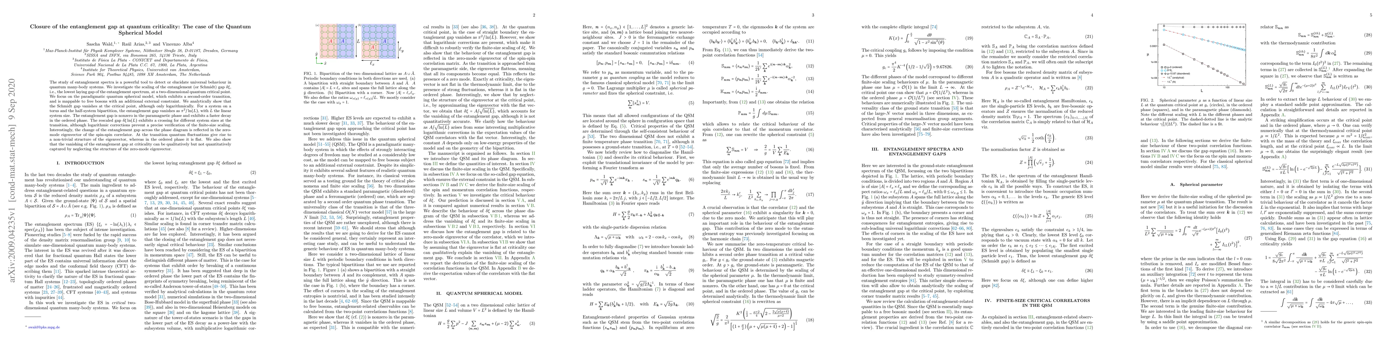 The study of entanglement spectra is a powerful tool to detect or elucidate universal behaviour in quantum many-body systems. We investigate the scaling of the entanglement (or Schmidt) gap $\delta\xi$, i.e., the lowest laying gap of the entanglement spectrum, at a two-dimensional quantum critical point. We focus on the paradigmatic quantum spherical model, which exhibits a second-order transition, and is mappable to free bosons with an additional external constraint. We analytically show that the Schmidt gap vanishes at the critical point, although only logarithmically. For a system on a torus and the half-system bipartition, the entanglement gap vanishes as $\pi^2/\ln(L)$, with $L$ the linear system size. The entanglement gap is nonzero in the paramagnetic phase and exhibits a faster decay in the ordered phase. The rescaled gap $\delta\xi\ln(L)$ exhibits a crossing for different system sizes at the transition, although logarithmic corrections prevent a precise verification of the finite-size scaling. Interestingly, the change of the entanglement gap across the phase diagram is reflected in the zero-mode eigenvector of the spin-spin correlator. At the transition quantum fluctuations give rise to a non-trivial structure of the eigenvector, whereas in the ordered phase it is flat. We also show that the vanishing of the entanglement gap at criticality can be qualitatively but not quantitatively captured by neglecting the structure of the zero-mode eigenvector.